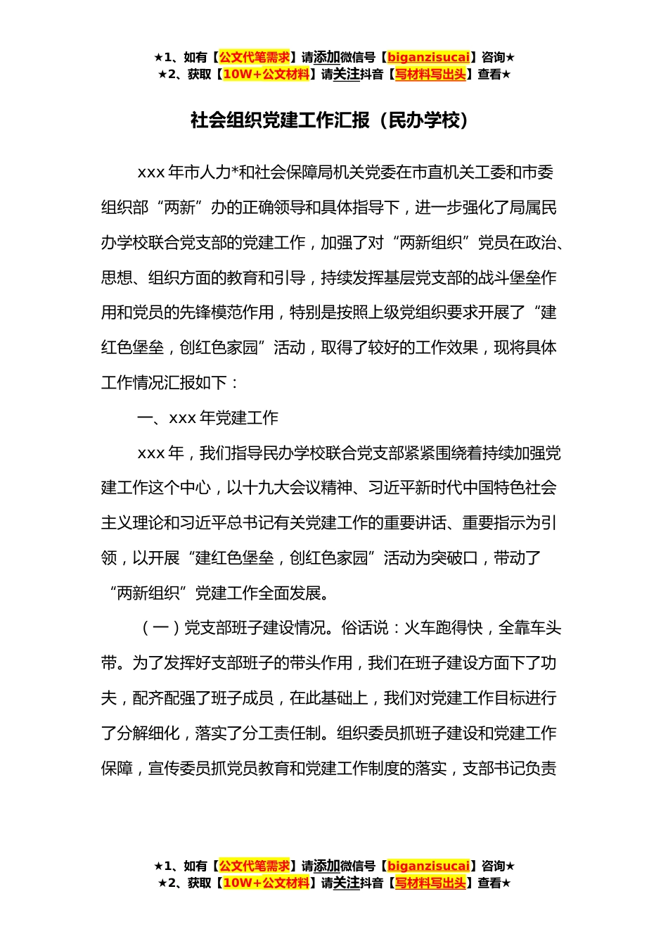 ★1、如有【公文代笔需求】请添加微信号【biganzisucai】咨询★★2、获取【10W+公文材料】请关注抖音【写材料写出头】查看★社会组织党建工作汇报(民办学校)xxx年市人力*和社会保障局机关党委在市直机关工委和市委组织部“两新”办的正确领导和具体指导下,进一步强化了局属民办学校联合党支部的党建工作,加强了对“两新组织”党员在政治、思想、组织方面的教育和引导,持续发挥基层党支部的战斗堡垒作用和党员的先锋模范作用,特别是按照上级党组织要求开展了“建红色堡垒,创红色家园”活动,取得了较好的工作效果,现将具体工作情况汇报如下:一、xxx年党建工作xxx年,我们指导民办学校联合党支部紧紧围绕着持续加强党建工作这个中心,以十九大会议精神、习近平新时代中国特色社会主义理论和习近平总书记有...