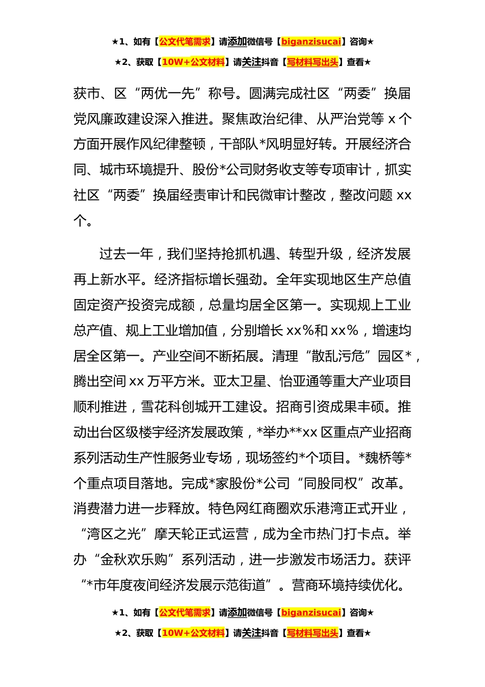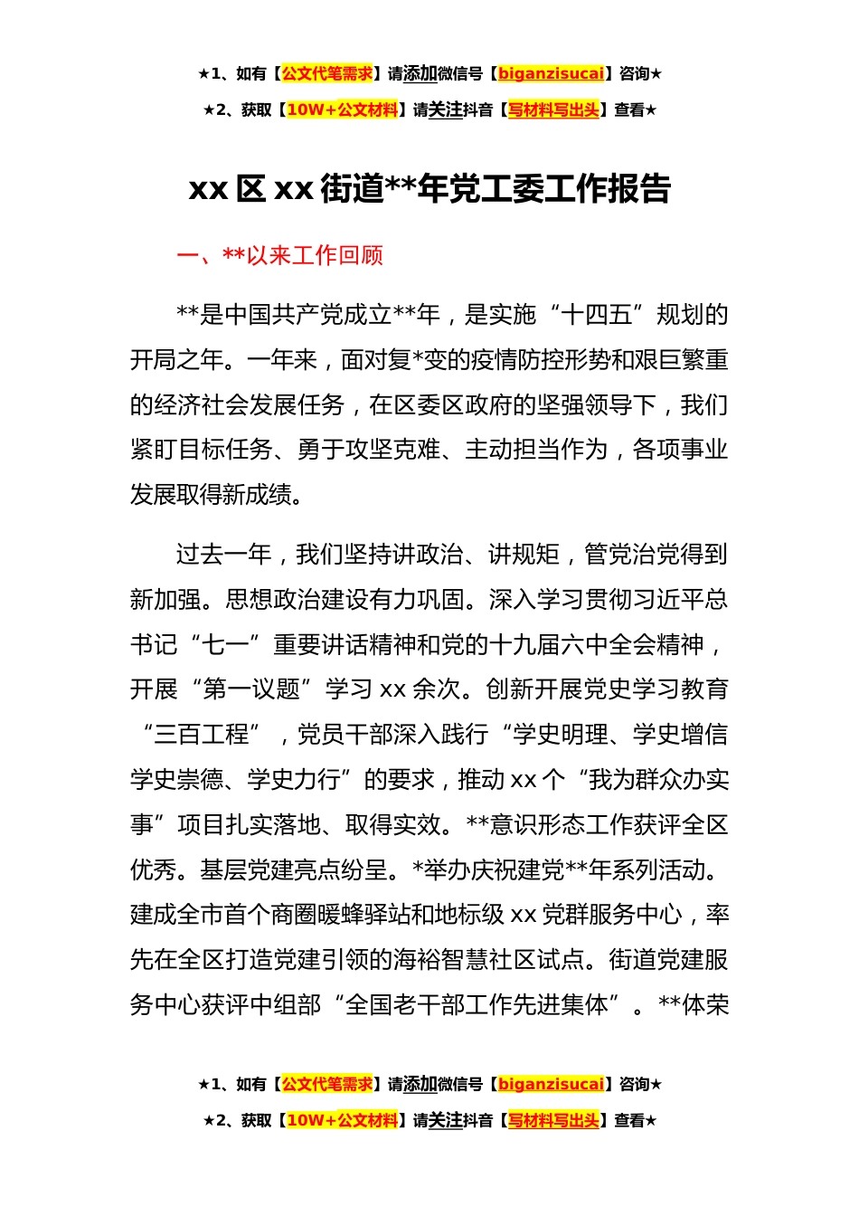 ★1、如有【公文代笔需求】请添加微信号【biganzisucai】咨询★★2、获取【10W+公文材料】请关注抖音【写材料写出头】查看★xx区xx街道**年党工委工作报告一、**以来工作回顾**是中国共产党成立**年,是实施“十四五”规划的开局之年。一年来,面对复*变的疫情防控形势和艰巨繁重的经济社会发展任务,在区委区政府的坚强领导下,我们紧盯目标任务、勇于攻坚克难、主动担当作为,各项事业发展取得新成绩。过去一年,我们坚持讲政治、讲规矩,管党治党得到新加强。思想政治建设有力巩固。深入学习贯彻习近平总书记“七一”重要讲话精神和党的十九届六中全会精神,开展“第一议题”学习xx余次。创新开展党史学习教育“三百工程”,党员干部深入践行“学史明理、学史增信学史崇德、学史力行”的要求,推动xx个“我为群...