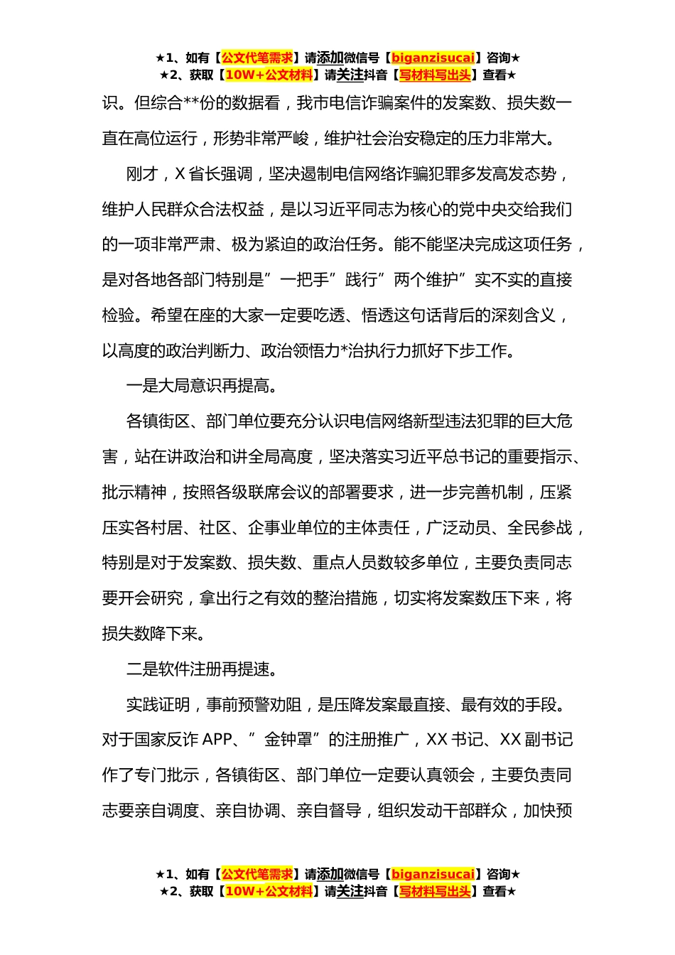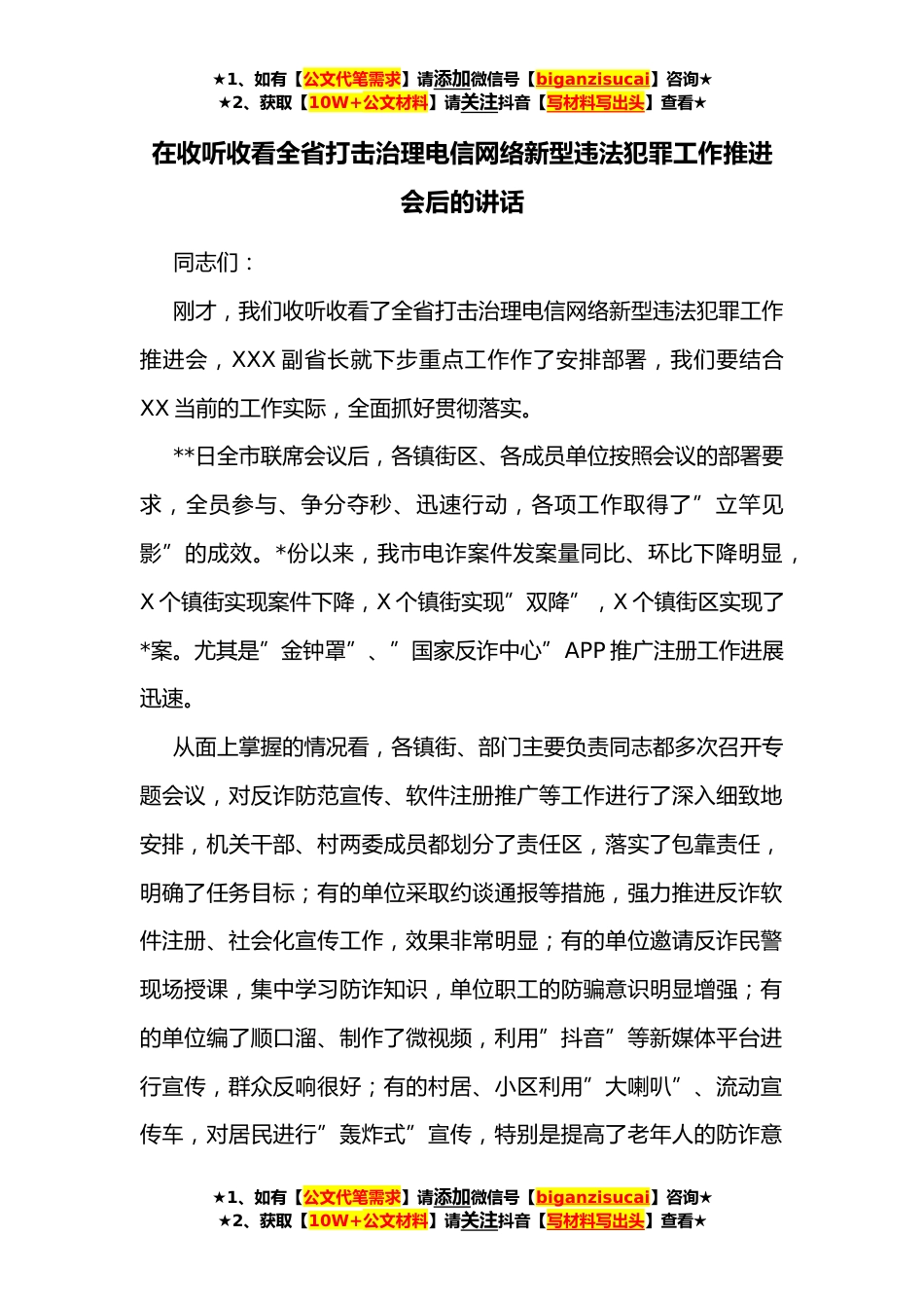 ★1、如有【公文代笔需求】请添加微信号【biganzisucai】咨询★★2、获取【10W+公文材料】请关注抖音【写材料写出头】查看★在收听收看全省打击治理电信网络新型违法犯罪工作推进会后的讲话同志们:刚才,我们收听收看了全省打击治理电信网络新型违法犯罪工作推进会,XXX副省长就下步重点工作作了安排部署,我们要结合XX当前的工作实际,全面抓好贯彻落实。**日全市联席会议后,各镇街区、各成员单位按照会议的部署要求,全员参与、争分夺秒、迅速行动,各项工作取得了”立竿见影”的成效。*份以来,我市电诈案件发案量同比、环比下降明显,X个镇街实现案件下降,X个镇街实现”双降”,X个镇街区实现了*案。尤其是”金钟罩”、”国家反诈中心”APP推广注册工作进展迅速。从面上掌握的情况看,各镇街、部门主要负责...