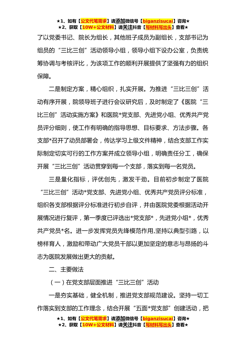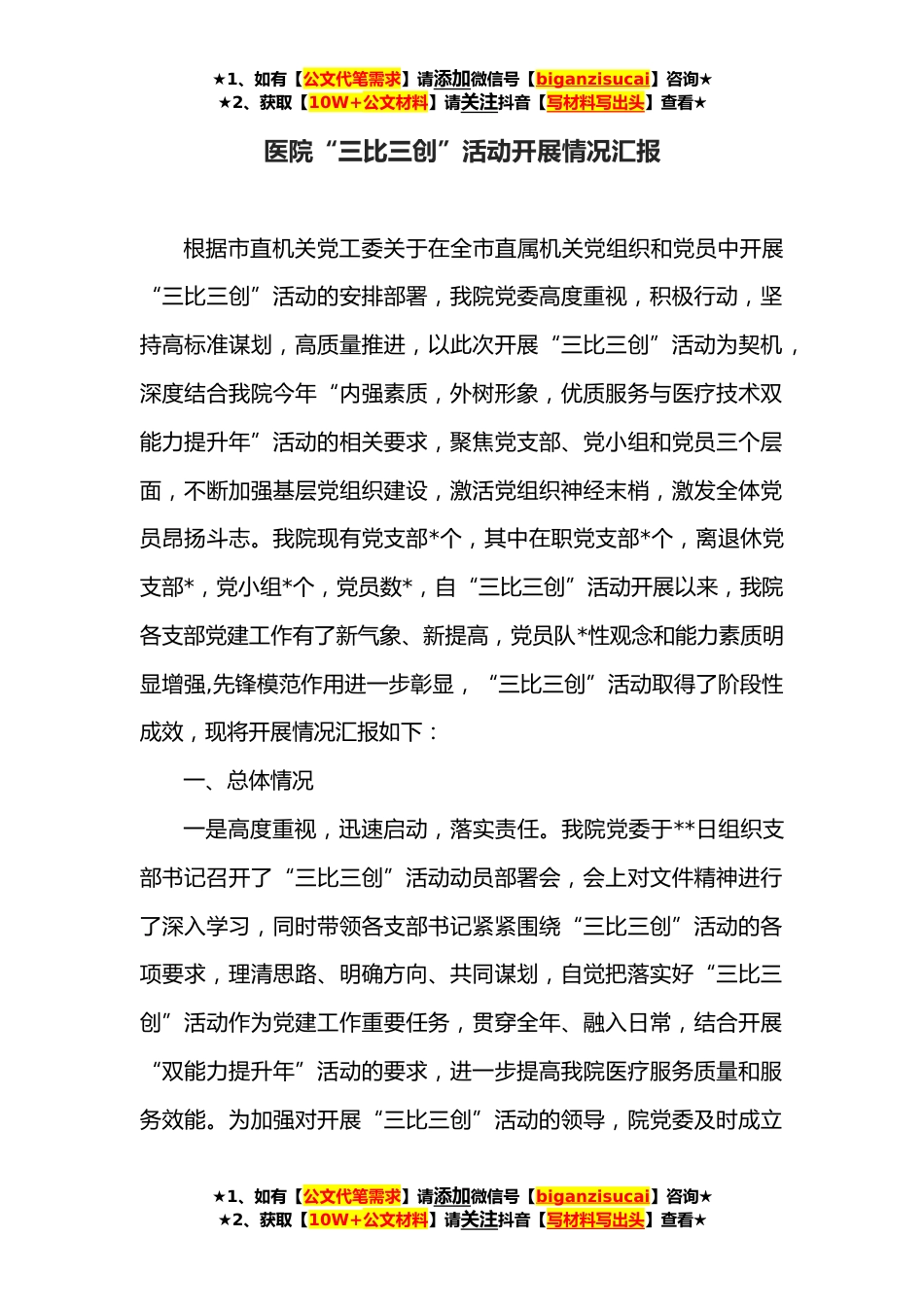 ★1、如有【公文代笔需求】请添加微信号【biganzisucai】咨询★★2、获取【10W+公文材料】请关注抖音【写材料写出头】查看★医院“三比三创”活动开展情况汇报根据市直机关党工委关于在全市直属机关党组织和党员中开展“三比三创”活动的安排部署,我院党委高度重视,积极行动,坚持高标准谋划,高质量推进,以此次开展“三比三创”活动为契机,深度结合我院今年“内强素质,外树形象,优质服务与医疗技术双能力提升年”活动的相关要求,聚焦党支部、党小组和党员三个层面,不断加强基层党组织建设,激活党组织神经末梢,激发全体党员昂扬斗志。我院现有党支部*个,其中在职党支部*个,离退休党支部*,党小组*个,党员数*,自“三比三创”活动开展以来,我院各支部党建工作有了新气象、新提高,党员队*性观念和能...