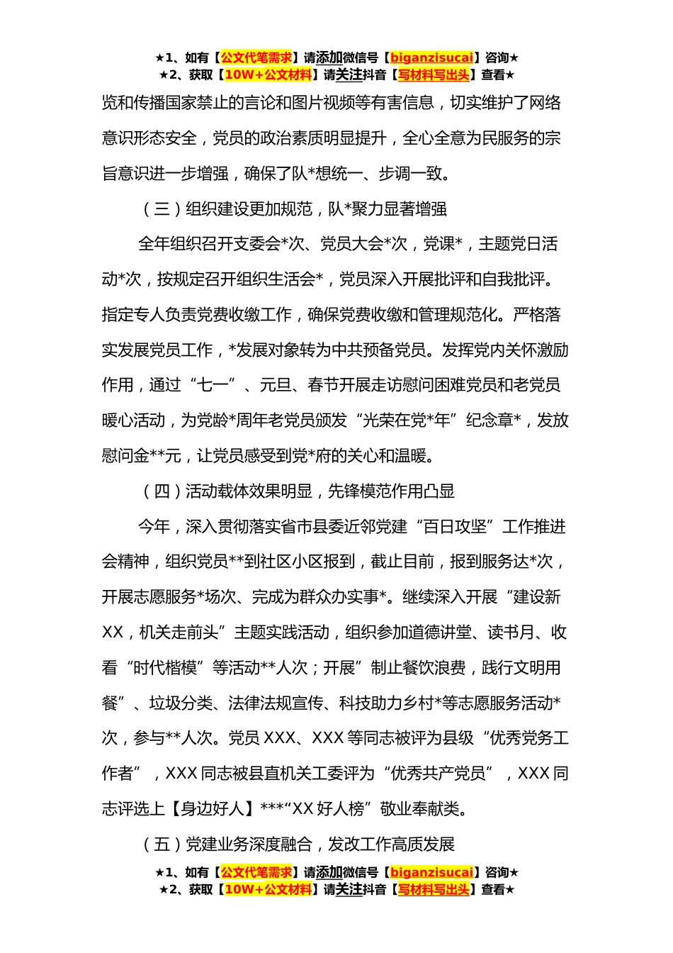 ★1、如有【公文代笔需求】请添加微信号【biganzisucai】咨询★★2、获取【10W+公文材料】请关注抖音【写材料写出头】查看★发改局党组书记抓基层党建述职报告一年来,本人在发改系统党委和局党组、党总支的领导下,坚持以习近平新时代中国特色社会主义思想为指导,深入学习贯彻党的十九大和十九届历次全会精神以及习近平总书记来闽重要讲话精神,以庆祝中国共产党成立一百周年为重点,扎实开展机关党支部建设。现将一年来抓基层党建工作报告如下:一、主要工作情况(一)政治建设坚强有力,队*质显著提高以纪念建党**年系列活动、党史学习教育等为契机,通过多形式多途径开展党史学习教育活动及政治理论学习,一年来,组织党员利用平台“持续学”、线上答题“争先学”、党课宣讲“系统学”、集体参观“现场学”、...