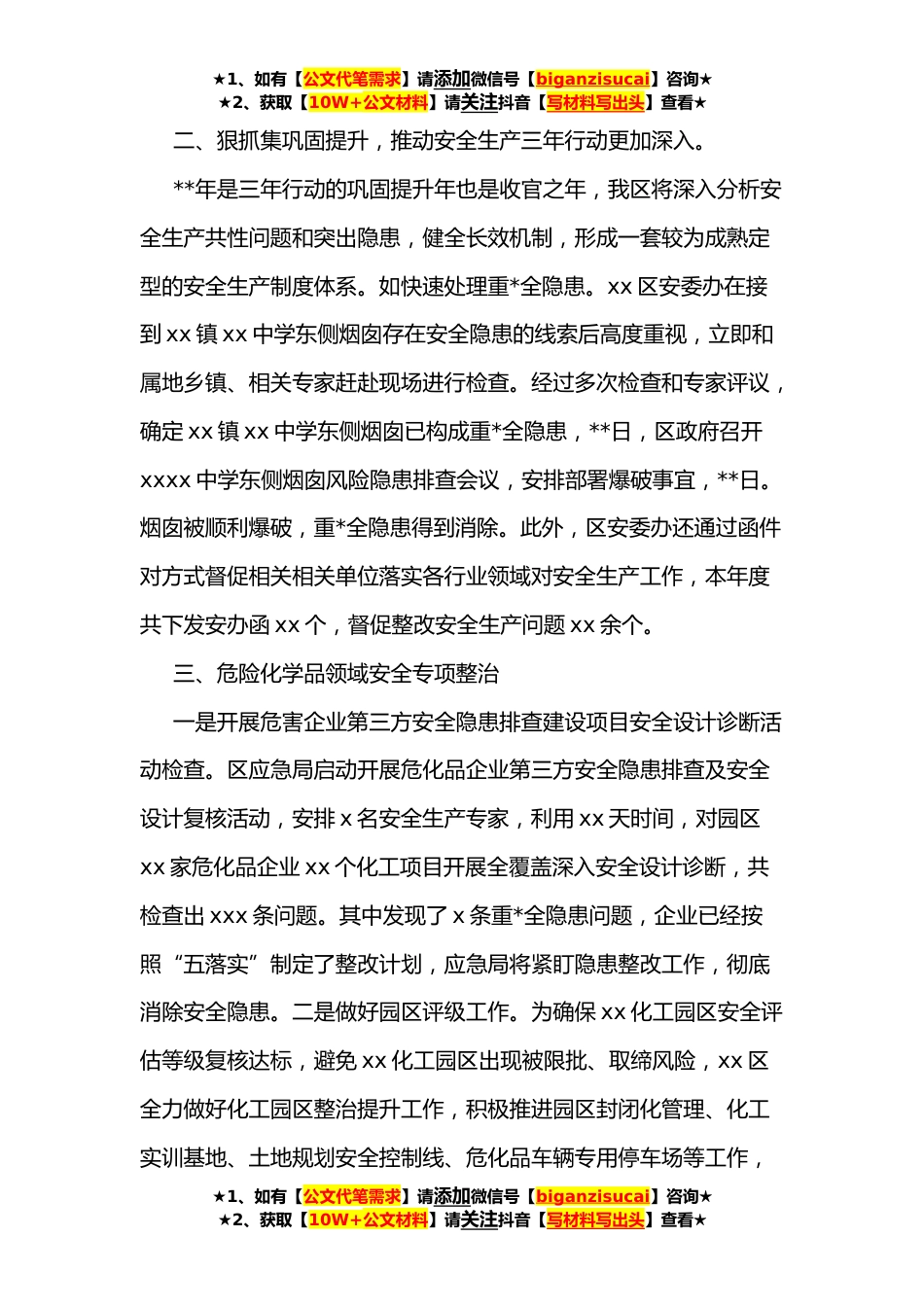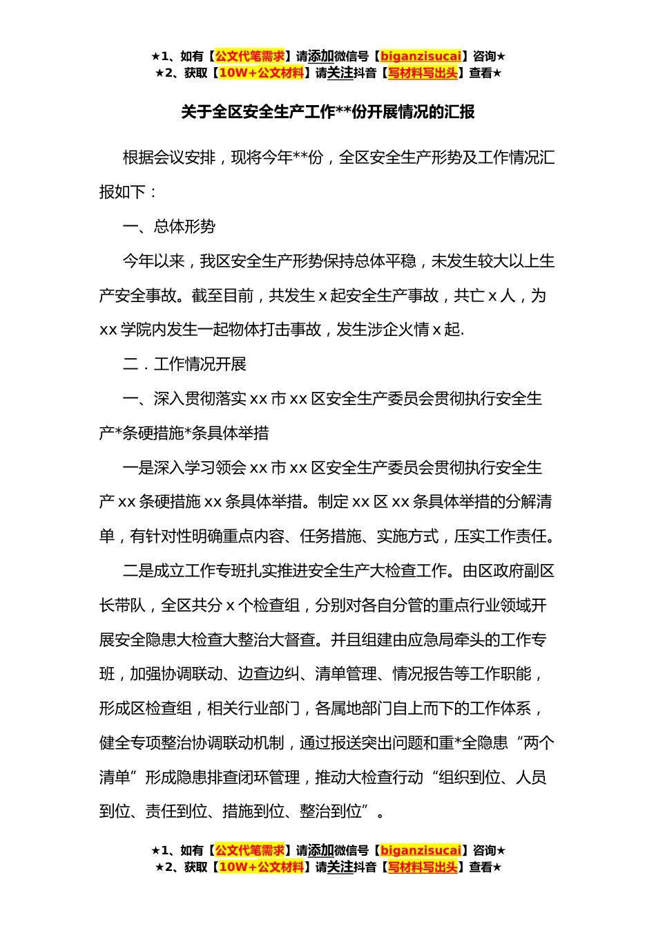 ★1、如有【公文代笔需求】请添加微信号【biganzisucai】咨询★★2、获取【10W+公文材料】请关注抖音【写材料写出头】查看★关于全区安全生产工作**份开展情况的汇报根据会议安排,现将今年**份,全区安全生产形势及工作情况汇报如下:一、总体形势今年以来,我区安全生产形势保持总体平稳,未发生较大以上生产安全事故。截至目前,共发生x起安全生产事故,共亡x人,为xx学院内发生一起物体打击事故,发生涉企火情x起.二.工作情况开展一、深入贯彻落实xx市xx区安全生产委员会贯彻执行安全生产*条硬措施*条具体举措一是深入学习领会xx市xx区安全生产委员会贯彻执行安全生产xx条硬措施xx条具体举措。制定xx区xx条具体举措的分解清单,有针对性明确重点内容、任务措施、实施方式,压实工作责任。二是成立工作专班扎...
