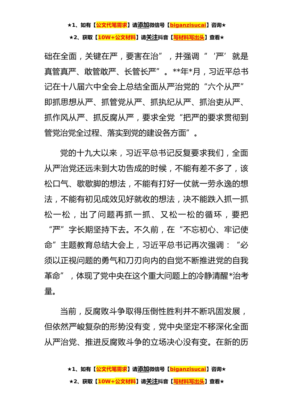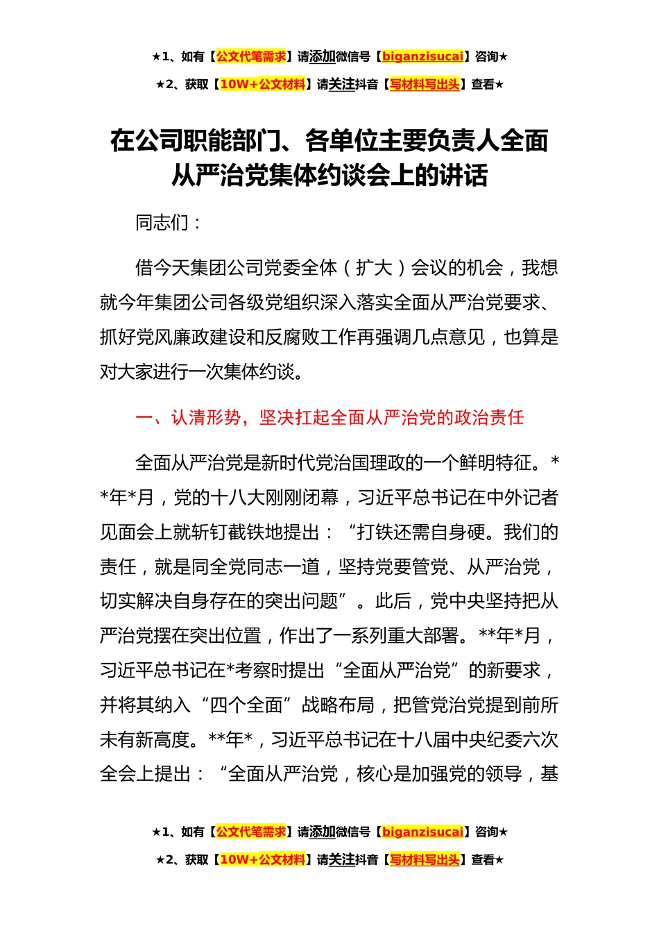 ★1、如有【公文代笔需求】请添加微信号【biganzisucai】咨询★★2、获取【10W+公文材料】请关注抖音【写材料写出头】查看★在公司职能部门、各单位主要负责人全面从严治党集体约谈会上的讲话同志们:借今天集团公司党委全体(扩大)会议的机会,我想就今年集团公司各级党组织深入落实全面从严治党要求、抓好党风廉政建设和反腐败工作再强调几点意见,也算是对大家进行一次集体约谈。一、认清形势,坚决扛起全面从严治党的政治责任全面从严治党是新时代党治国理政的一个鲜明特征。**年*月,党的十八大刚刚闭幕,习近平总书记在中外记者见面会上就斩钉截铁地提出:“打铁还需自身硬。我们的责任,就是同全党同志一道,坚持党要管党、从严治党,切实解决自身存在的突出问题”。此后,党中央坚持把从严治党摆在突出位...