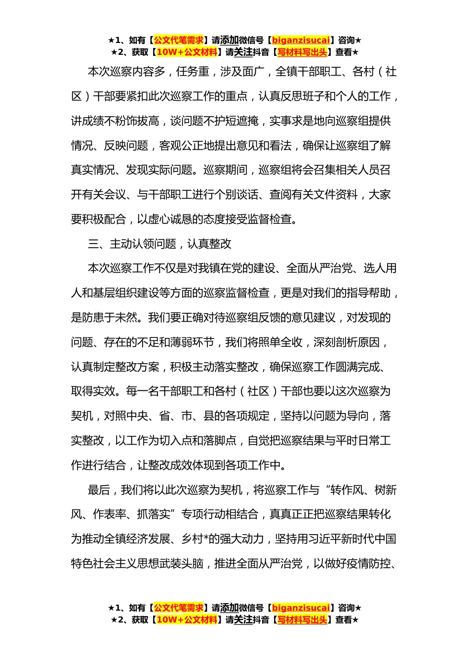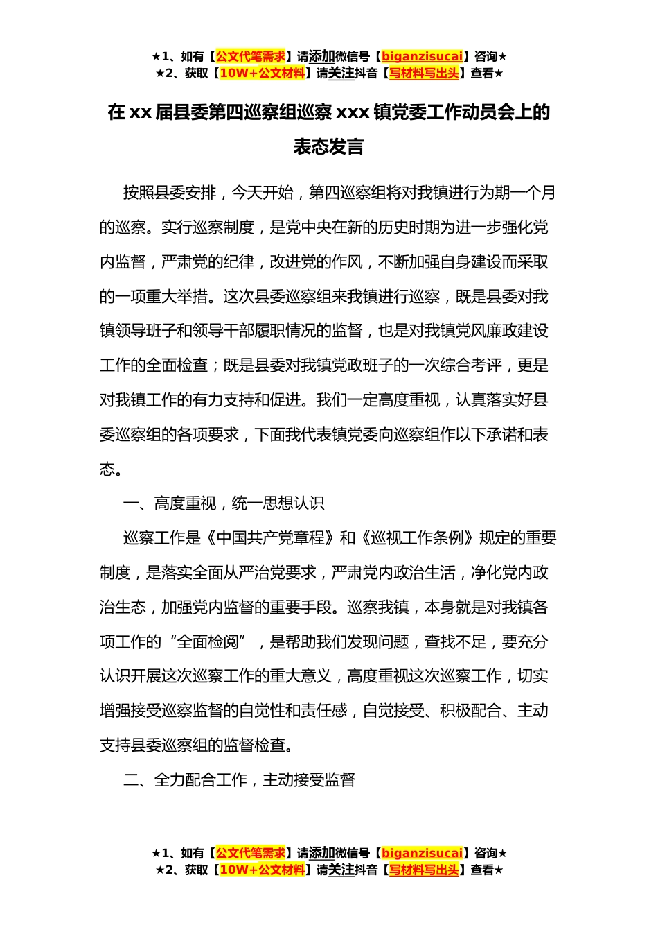 ★1、如有【公文代笔需求】请添加微信号【biganzisucai】咨询★★2、获取【10W+公文材料】请关注抖音【写材料写出头】查看★在xx届县委第四巡察组巡察xxx镇党委工作动员会上的表态发言按照县委安排,今天开始,第四巡察组将对我镇进行为期一个月的巡察。实行巡察制度,是党中央在新的历史时期为进一步强化党内监督,严肃党的纪律,改进党的作风,不断加强自身建设而采取的一项重大举措。这次县委巡察组来我镇进行巡察,既是县委对我镇领导班子和领导干部履职情况的监督,也是对我镇党风廉政建设工作的全面检查;既是县委对我镇党政班子的一次综合考评,更是对我镇工作的有力支持和促进。我们一定高度重视,认真落实好县委巡察组的各项要求,下面我代表镇党委向巡察组作以下承诺和表态。一、高度重视,统一思想认识...