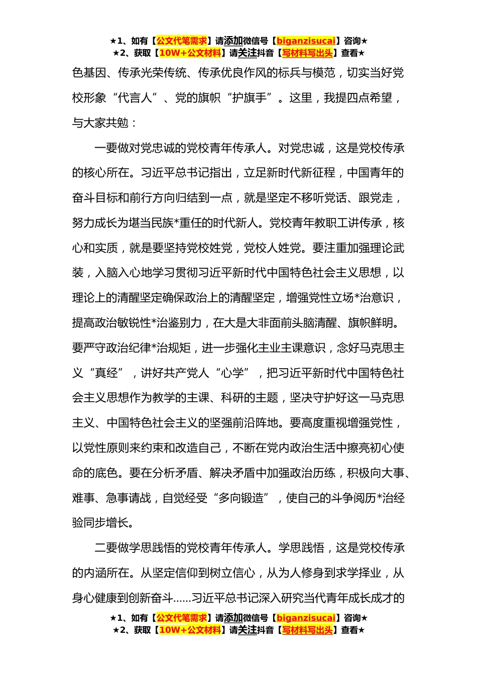 ★1、如有【公文代笔需求】请添加微信号【biganzisucai】咨询★★2、获取【10W+公文材料】请关注抖音【写材料写出头】查看★在党校青年教职工座谈会上的讲话同志们:大家好。今年是中国共产主义青年团成立**年,今天我们召开全校青年教职工座谈会,主要任务是深入学习贯彻习近平总书记对青年工作提出的一系列新思想新观点新论断,学习习近平总书记关于党校办学治校系列重要指示的真理力量,学习习近平总书记**日在中国人民大学考察调研时重要讲话精神,学习习近平总书记**对广大航天青年重要回信精神,深化对“两个确立”决定性意义的认识理解,进一步引导党校每一位青年教职工,把个人成长与党校事业紧紧联系在一起,深刻认识肩负责任,格外珍惜党校平台,旗帜鲜明讲政治,脚踏实地做工作,牢记党的教诲,立志民...