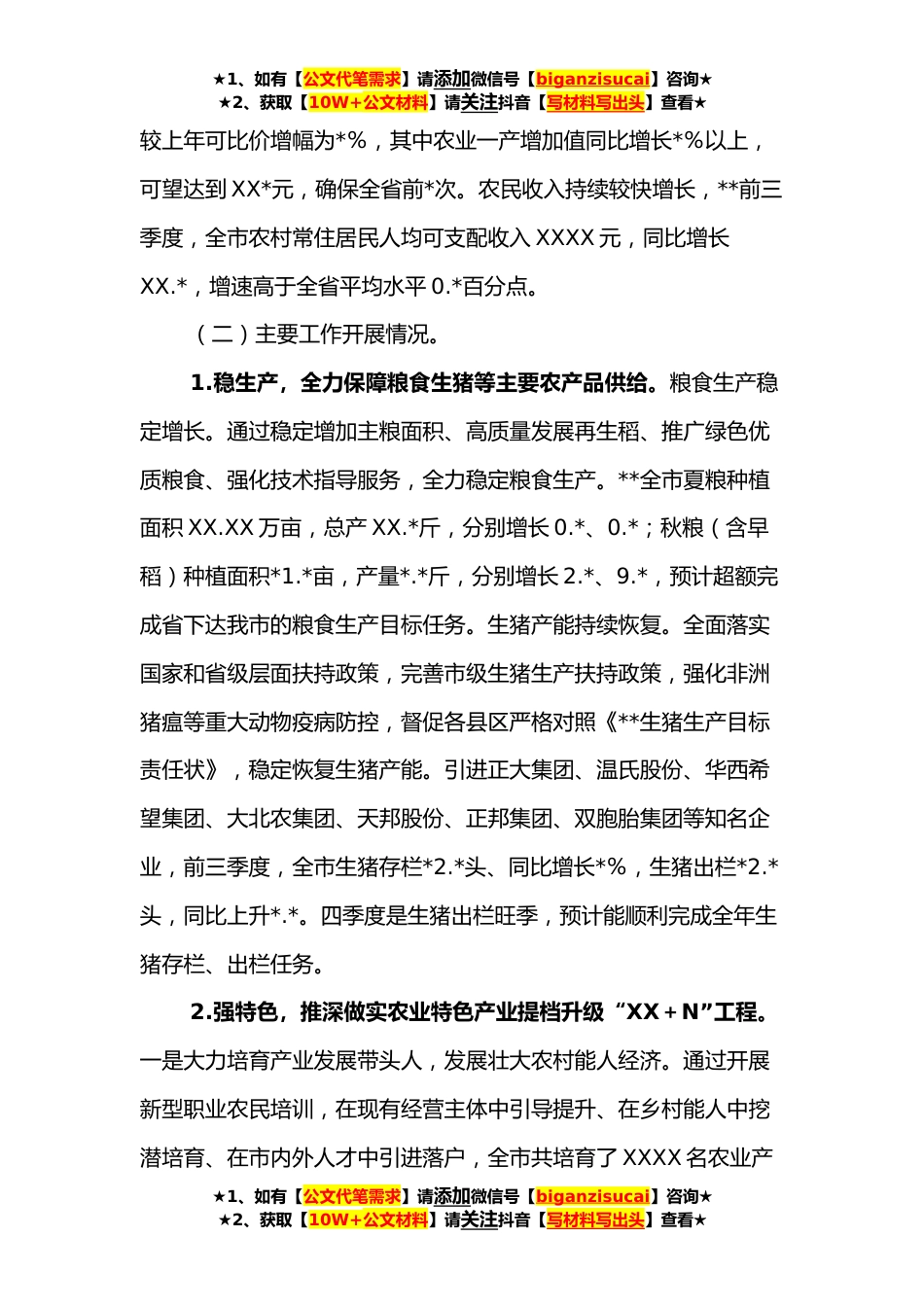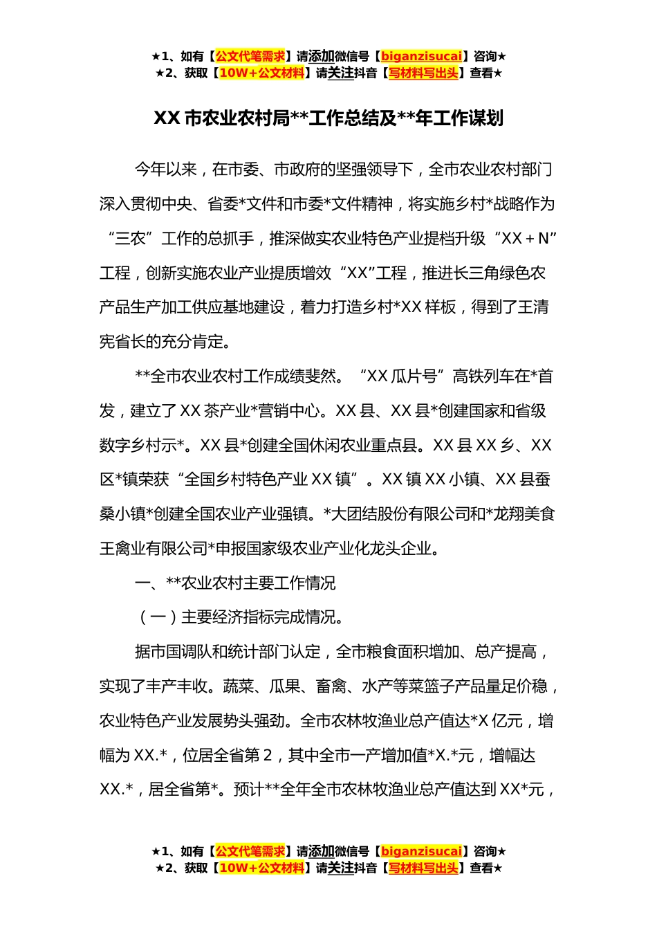 ★1、如有【公文代笔需求】请添加微信号【biganzisucai】咨询★★2、获取【10W+公文材料】请关注抖音【写材料写出头】查看★XX市农业农村局**工作总结及**年工作谋划今年以来,在市委、市政府的坚强领导下,全市农业农村部门深入贯彻中央、省委*文件和市委*文件精神,将实施乡村*战略作为“三农”工作的总抓手,推深做实农业特色产业提档升级“XX+N”工程,创新实施农业产业提质增效“XX”工程,推进长三角绿色农产品生产加工供应基地建设,着力打造乡村*XX样板,得到了王清宪省长的充分肯定。**全市农业农村工作成绩斐然。“XX瓜片号”高铁列车在*首发,建立了XX茶产业*营销中心。XX县、XX县*创建国家和省级数字乡村示*。XX县*创建全国休闲农业重点县。XX县XX乡、XX区*镇荣获“全国乡村特色产业XX镇”。XX镇XX小...