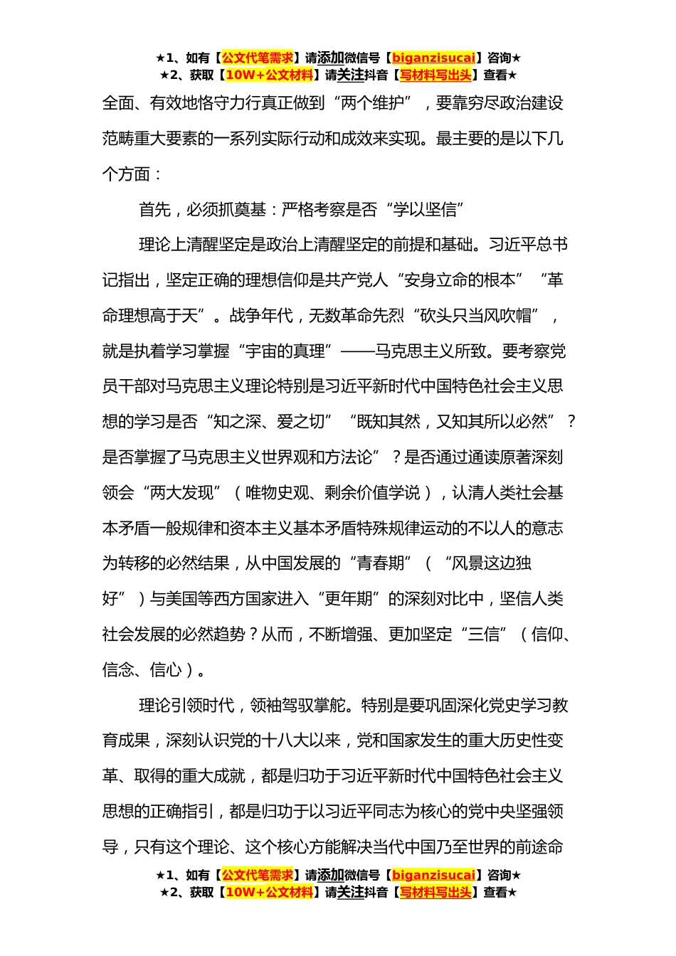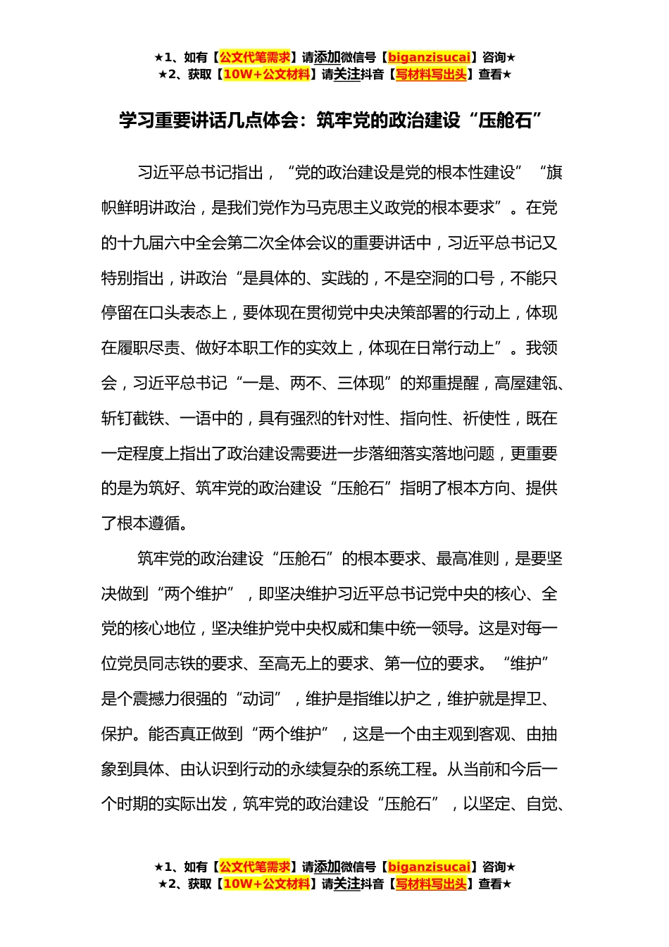 ★1、如有【公文代笔需求】请添加微信号【biganzisucai】咨询★★2、获取【10W+公文材料】请关注抖音【写材料写出头】查看★学习重要讲话几点体会:筑牢党的政治建设“压舱石”习近平总书记指出,“党的政治建设是党的根本性建设”“旗帜鲜明讲政治,是我们党作为马克思主义政党的根本要求”。在党的十九届六中全会第二次全体会议的重要讲话中,习近平总书记又特别指出,讲政治“是具体的、实践的,不是空洞的口号,不能只停留在口头表态上,要体现在贯彻党中央决策部署的行动上,体现在履职尽责、做好本职工作的实效上,体现在日常行动上”。我领会,习近平总书记“一是、两不、三体现”的郑重提醒,高屋建瓴、斩钉截铁、一语中的,具有强烈的针对性、指向性、祈使性,既在一定程度上指出了政治建设需要进一步落...