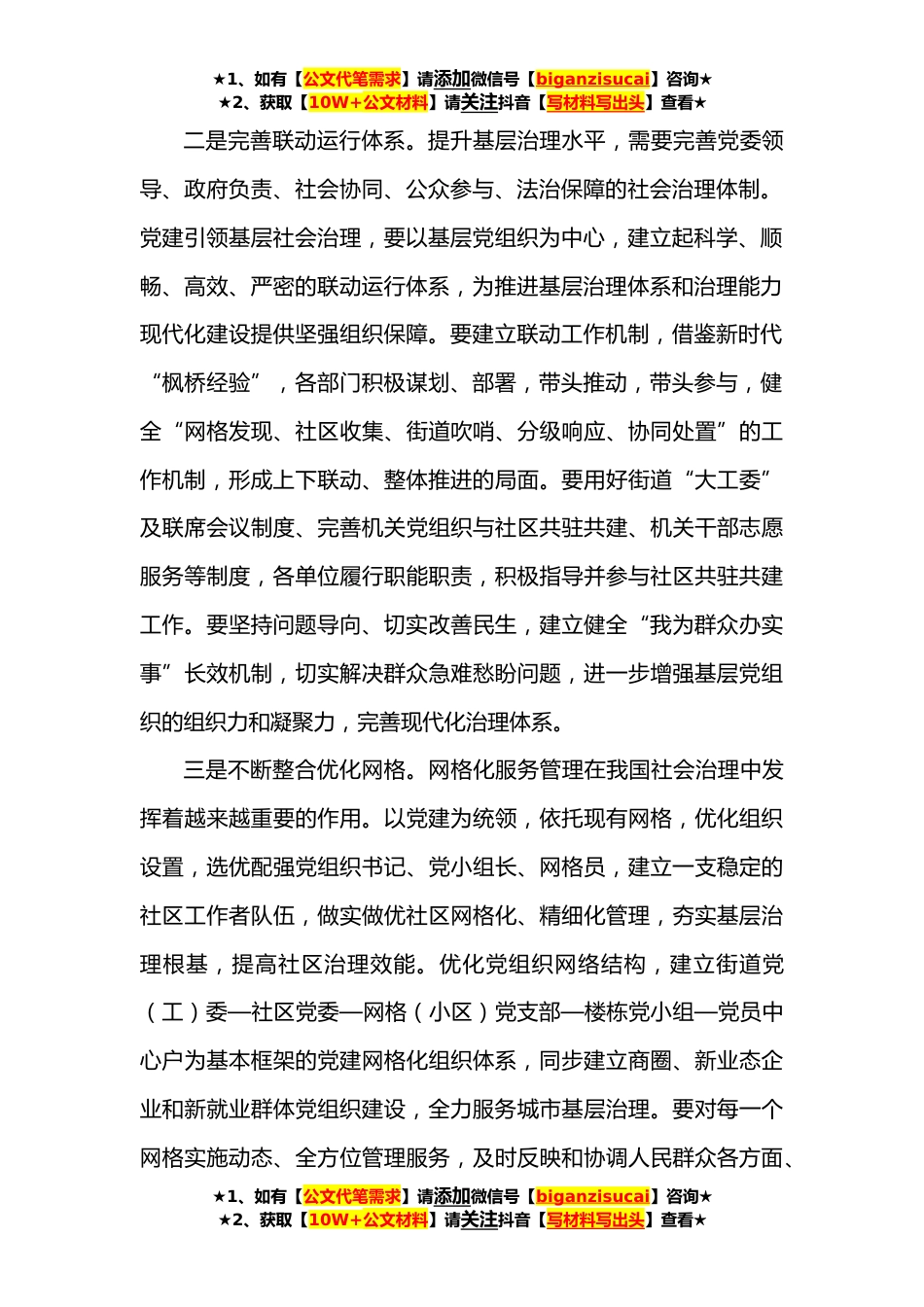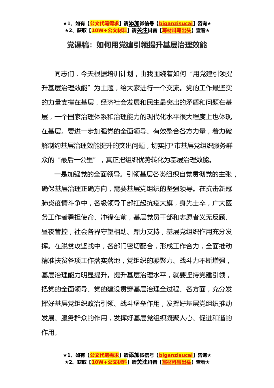 ★1、如有【公文代笔需求】请添加微信号【biganzisucai】咨询★★2、获取【10W+公文材料】请关注抖音【写材料写出头】查看★党课稿:如何用党建引领提升基层治理效能同志们,今天根据培训计划,由我围绕着如何“用党建引领提升基层治理效能”为主题,给大家进行一个交流。党的工作最坚实的力量支撑在基层,经济社会发展和民生最突出的矛盾和问题在基层,一个国家治理体系和治理能力的现代化水平很大程度上也体现在基层。要进一步加强党的全面领导、有效整合各方力量,着力破解制约基层治理效能提升的突出问题,切实打*市基层党组织服务群众的“最后一公里”,真正把组织优势转化为基层治理效能。一是加强党的全面领导。引领基层各类组织自觉贯彻党的主张,确保基层治理正确方向,需要基层党组织的坚强领导。在抗击...