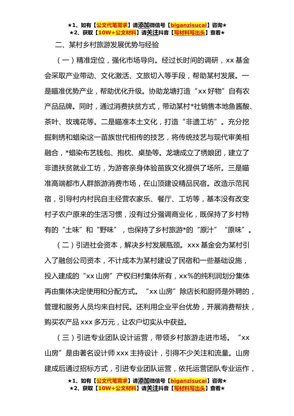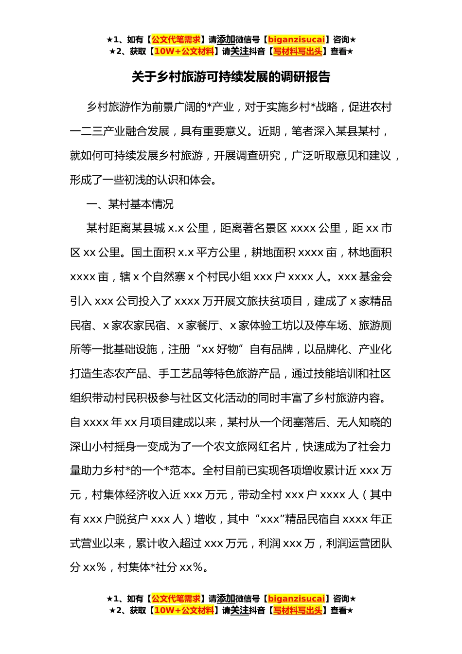 ★1、如有【公文代笔需求】请添加微信号【biganzisucai】咨询★★2、获取【10W+公文材料】请关注抖音【写材料写出头】查看★关于乡村旅游可持续发展的调研报告乡村旅游作为前景广阔的*产业,对于实施乡村*战略,促进农村一二三产业融合发展,具有重要意义。近期,笔者深入某县某村,就如何可持续发展乡村旅游,开展调查研究,广泛听取意见和建议,形成了一些初浅的认识和体会。一、某村基本情况某村距离某县城x.x公里,距离著名景区xxxx公里,距xx市区xx公里。国土面积x.x平方公里,耕地面积xxxx亩,林地面积xxxx亩,辖x个自然寨x个村民小组xxx户xxxx人。xxx基金会引入xxx公司投入了xxxx万开展文旅扶贫项目,建成了x家精品民宿、x家农家民宿、x家餐厅、x家体验工坊以及停车场、旅游厕所等一批基础设施,注册“xx好...