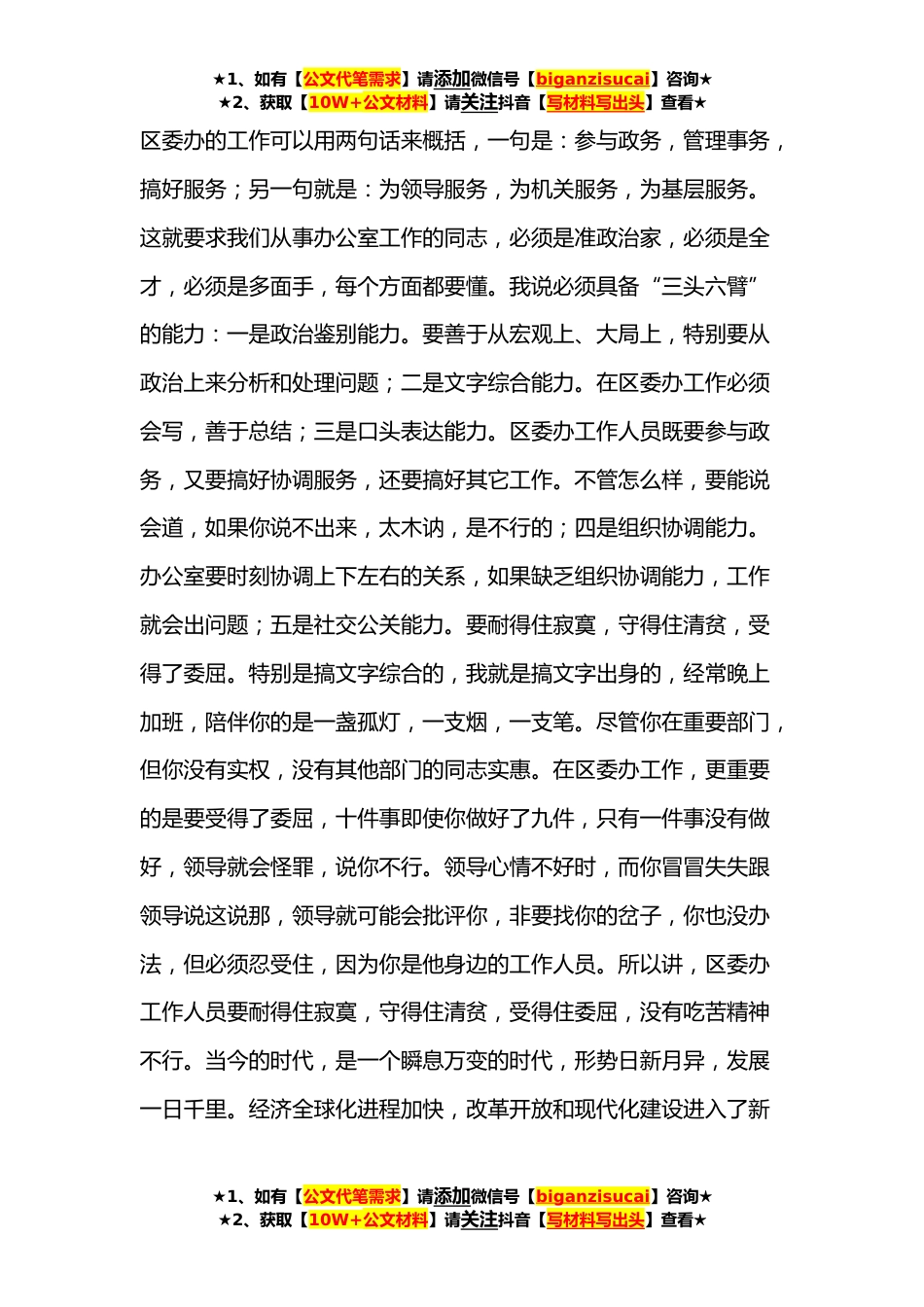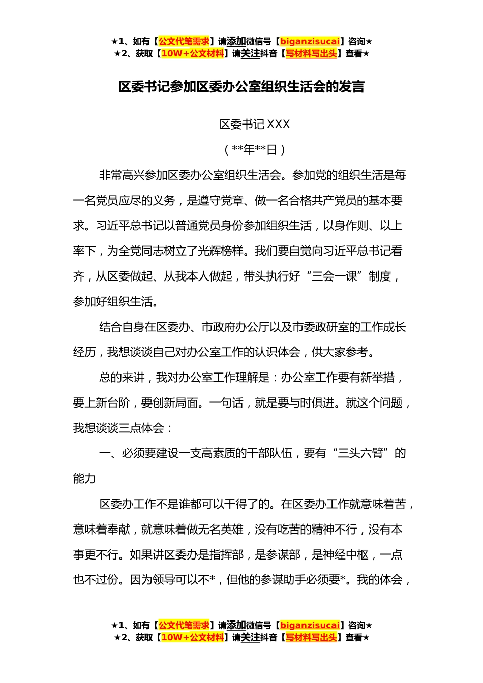 ★1、如有【公文代笔需求】请添加微信号【biganzisucai】咨询★★2、获取【10W+公文材料】请关注抖音【写材料写出头】查看★区委书记参加区委办公室组织生活会的发言区委书记XXX(**年**日)非常高兴参加区委办公室组织生活会。参加党的组织生活是每一名党员应尽的义务,是遵守党章、做一名合格共产党员的基本要求。习近平总书记以普通党员身份参加组织生活,以身作则、以上率下,为全党同志树立了光辉榜样。我们要自觉向习近平总书记看齐,从区委做起、从我本人做起,带头执行好“三会一课”制度,参加好组织生活。结合自身在区委办、市政府办公厅以及市委政研室的工作成长经历,我想谈谈自己对办公室工作的认识体会,供大家参考。总的来讲,我对办公室工作理解是:办公室工作要有新举措,要上新台阶,要创新局面...