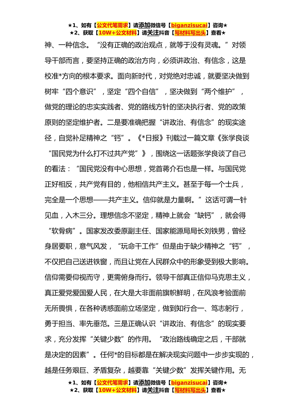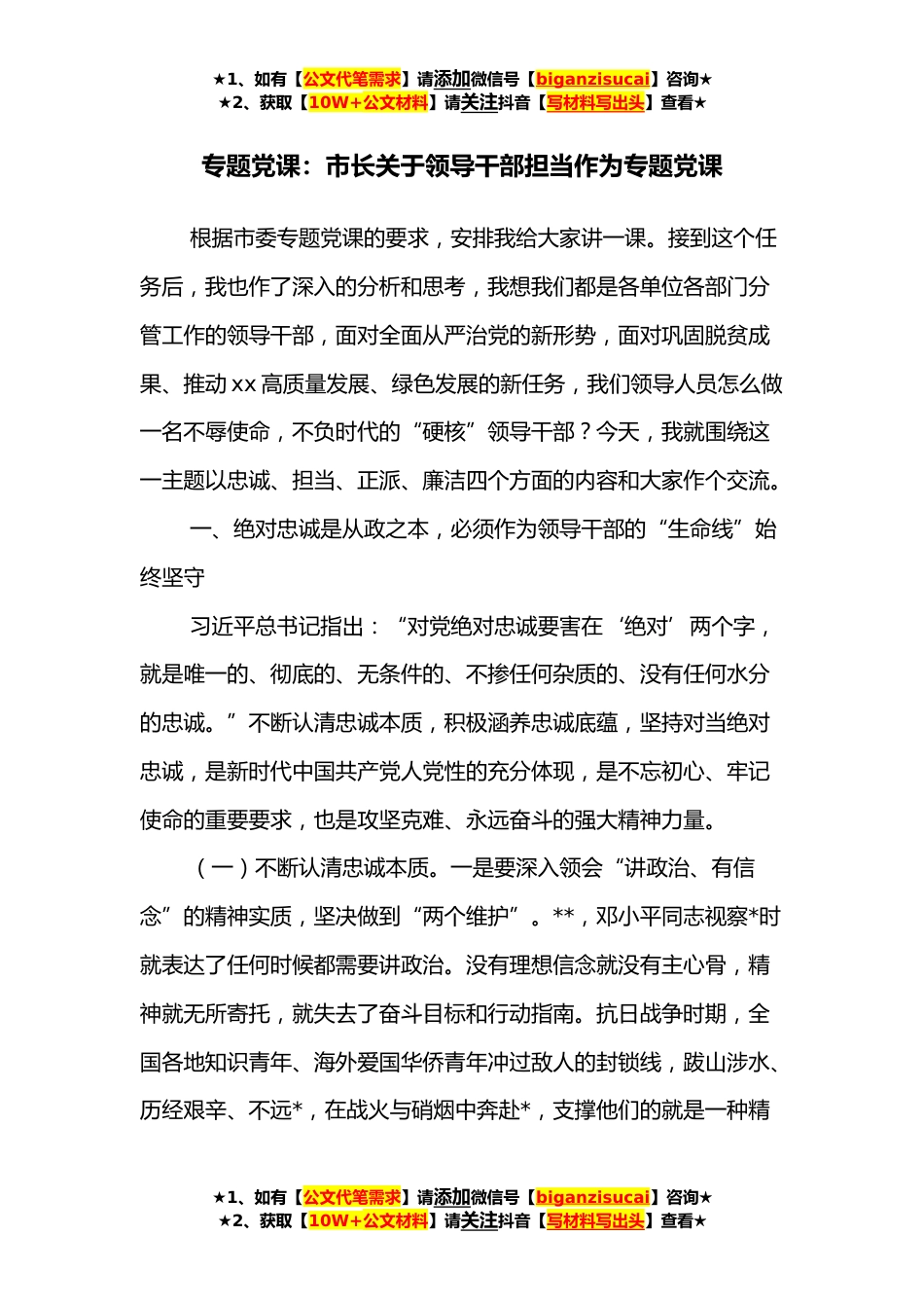 ★1、如有【公文代笔需求】请添加微信号【biganzisucai】咨询★★2、获取【10W+公文材料】请关注抖音【写材料写出头】查看★专题党课:市长关于领导干部担当作为专题党课根据市委专题党课的要求,安排我给大家讲一课。接到这个任务后,我也作了深入的分析和思考,我想我们都是各单位各部门分管工作的领导干部,面对全面从严治党的新形势,面对巩固脱贫成果、推动xx高质量发展、绿色发展的新任务,我们领导人员怎么做一名不辱使命,不负时代的“硬核”领导干部?今天,我就围绕这一主题以忠诚、担当、正派、廉洁四个方面的内容和大家作个交流。一、绝对忠诚是从政之本,必须作为领导干部的“生命线”始终坚守习近平总书记指出:“对党绝对忠诚要害在‘绝对’两个字,就是唯一的、彻底的、无条件的、不掺任何杂质的...