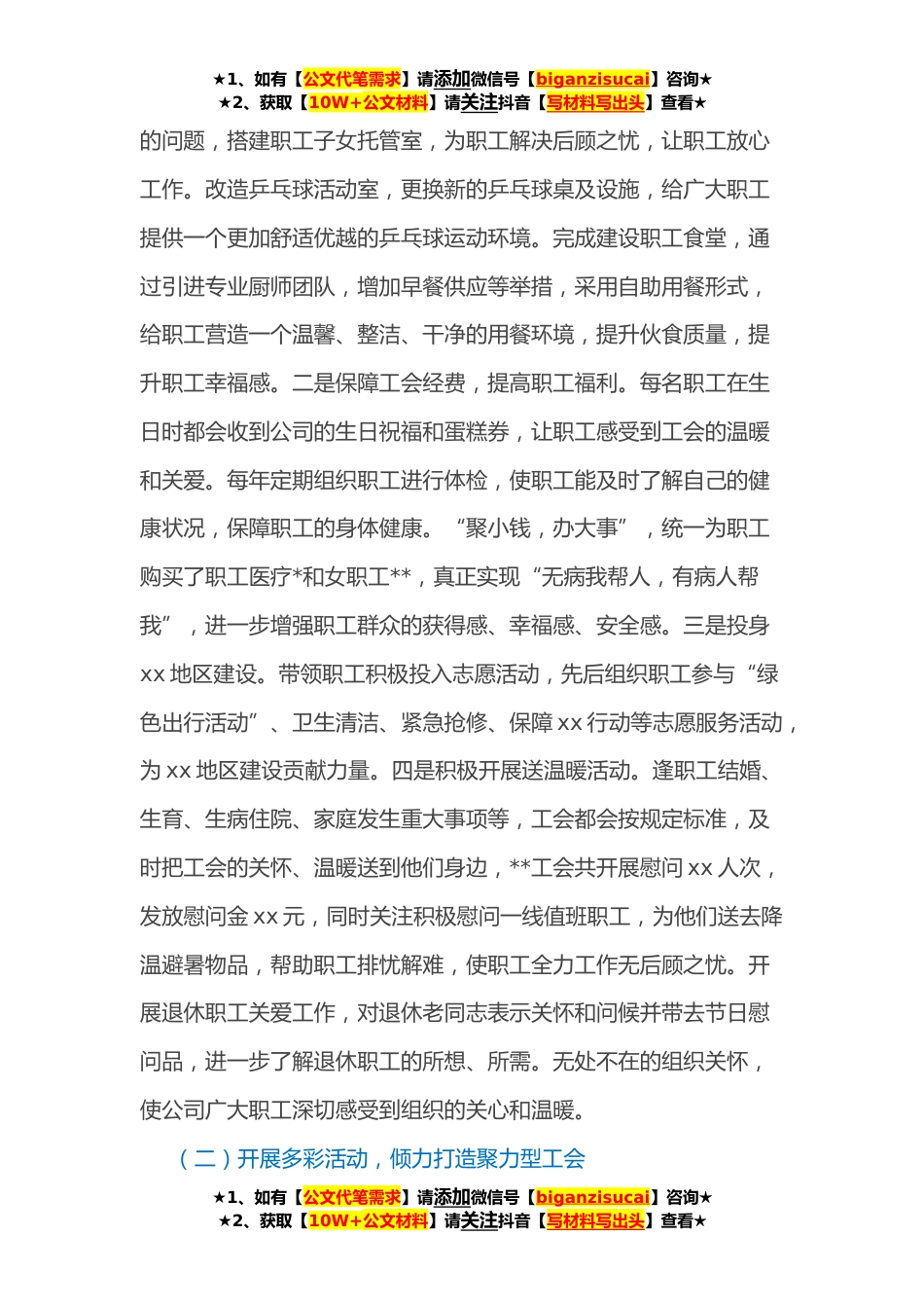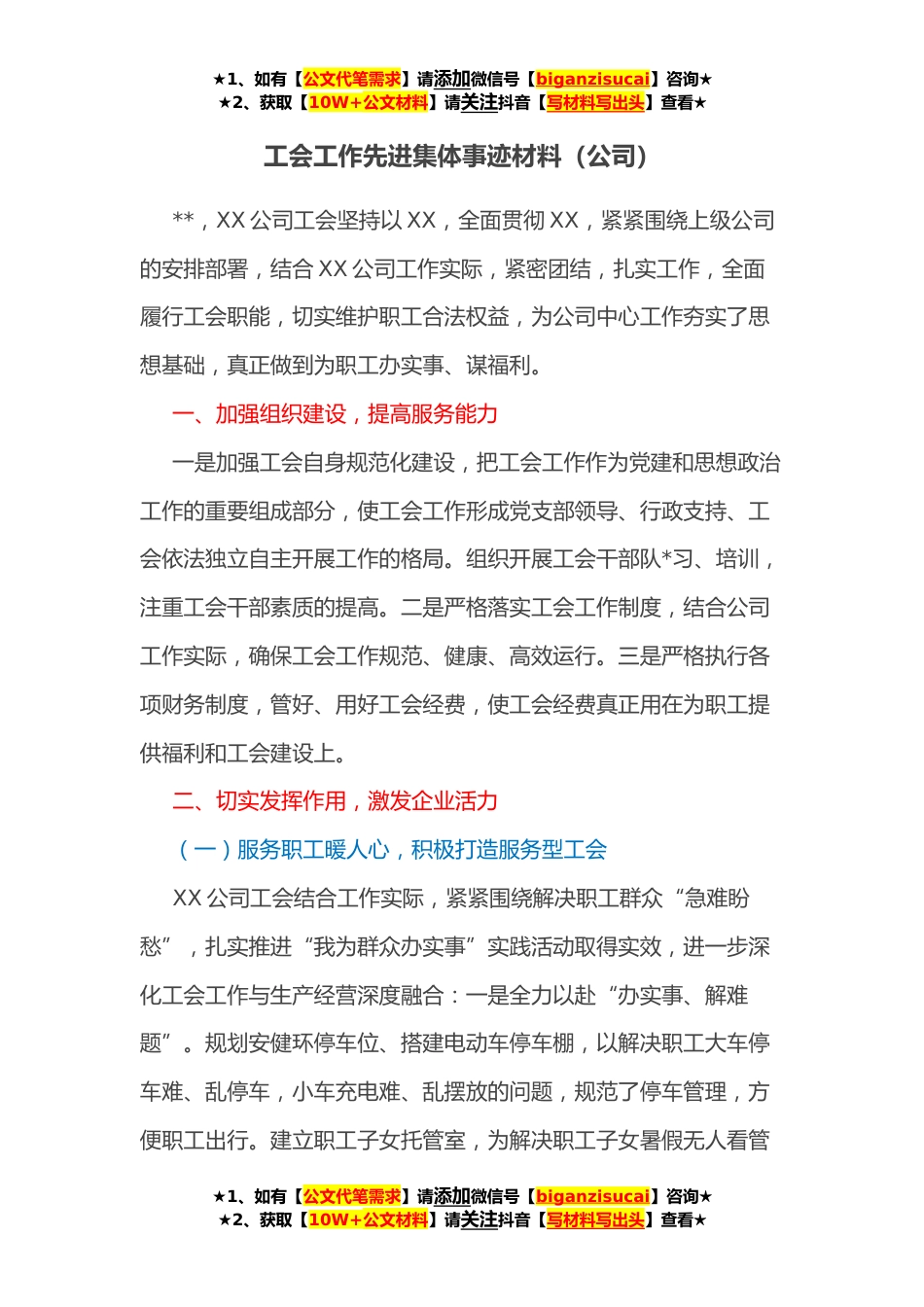 ★1、如有【公文代笔需求】请添加微信号【biganzisucai】咨询★★2、获取【10W+公文材料】请关注抖音【写材料写出头】查看★工会工作先进集体事迹材料(公司)**,XX公司工会坚持以XX,全面贯彻XX,紧紧围绕上级公司的安排部署,结合XX公司工作实际,紧密团结,扎实工作,全面履行工会职能,切实维护职工合法权益,为公司中心工作夯实了思想基础,真正做到为职工办实事、谋福利。一、加强组织建设,提高服务能力一是加强工会自身规范化建设,把工会工作作为党建和思想政治工作的重要组成部分,使工会工作形成党支部领导、行政支持、工会依法独立自主开展工作的格局。组织开展工会干部队*习、培训,注重工会干部素质的提高。二是严格落实工会工作制度,结合公司工作实际,确保工会工作规范、健康、高效运行。三是严...