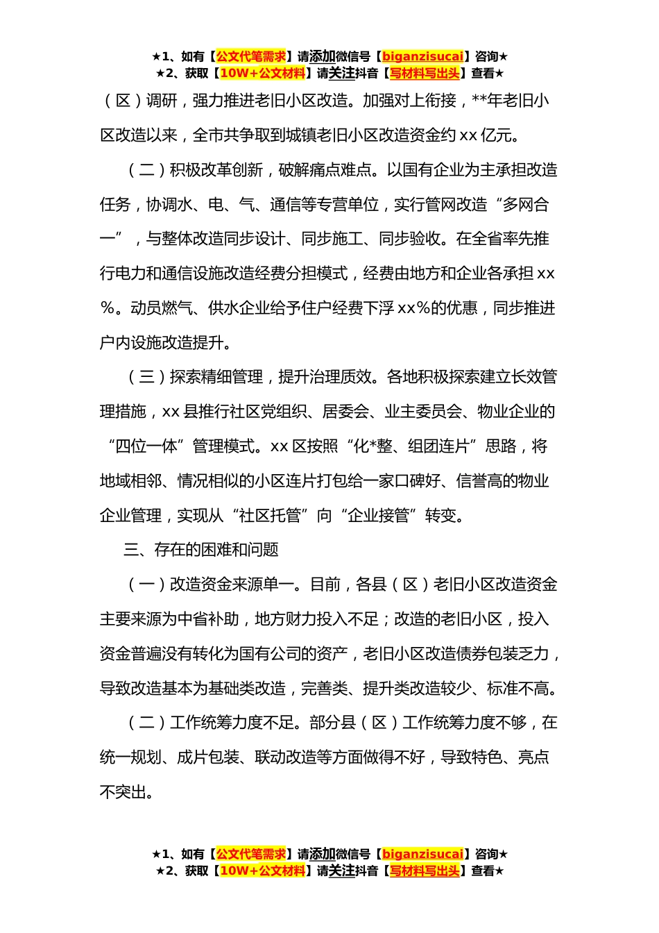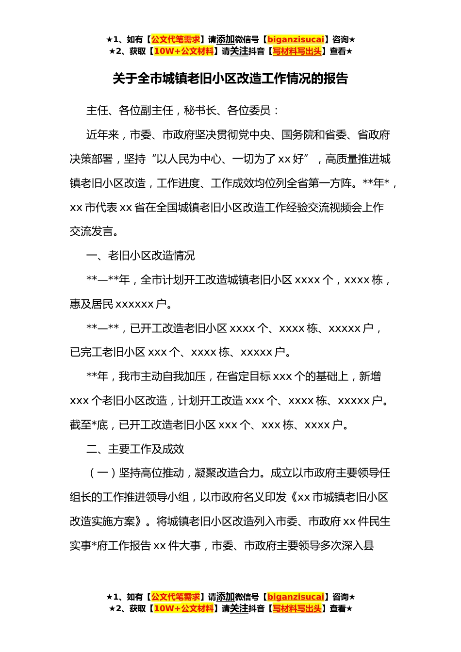 ★1、如有【公文代笔需求】请添加微信号【biganzisucai】咨询★★2、获取【10W+公文材料】请关注抖音【写材料写出头】查看★关于全市城镇老旧小区改造工作情况的报告主任、各位副主任,秘书长、各位委员:近年来,市委、市政府坚决贯彻党中央、国务院和省委、省政府决策部署,坚持“以人民为中心、一切为了xx好”,高质量推进城镇老旧小区改造,工作进度、工作成效均位列全省第一方阵。**年*,xx市代表xx省在全国城镇老旧小区改造工作经验交流视频会上作交流发言。一、老旧小区改造情况**—**年,全市计划开工改造城镇老旧小区xxxx个,xxxx栋,惠及居民xxxxxx户。**—**,已开工改造老旧小区xxxx个、xxxx栋、xxxxx户,已完工老旧小区xxx个、xxxx栋、xxxxx户。**年,我市主动自我加压,在省定目标xxx个的基础上,新...