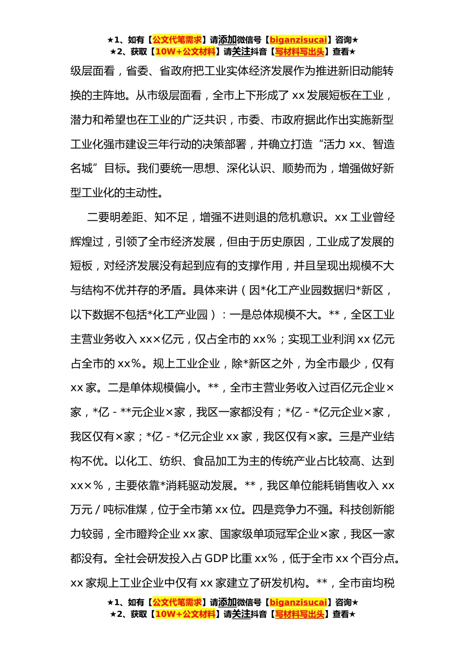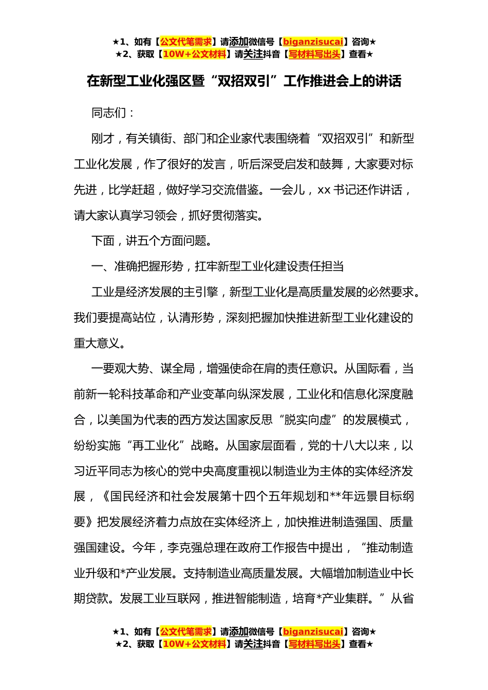 ★1、如有【公文代笔需求】请添加微信号【biganzisucai】咨询★★2、获取【10W+公文材料】请关注抖音【写材料写出头】查看★在新型工业化强区暨“双招双引”工作推进会上的讲话同志们:刚才,有关镇街、部门和企业家代表围绕着“双招双引”和新型工业化发展,作了很好的发言,听后深受启发和鼓舞,大家要对标先进,比学赶超,做好学习交流借鉴。一会儿,xx书记还作讲话,请大家认真学习领会,抓好贯彻落实。下面,讲五个方面问题。一、准确把握形势,扛牢新型工业化建设责任担当工业是经济发展的主引擎,新型工业化是高质量发展的必然要求。我们要提高站位,认清形势,深刻把握加快推进新型工业化建设的重大意义。一要观大势、谋全局,增强使命在肩的责任意识。从国际看,当前新一轮科技革命和产业变革向纵深发展...