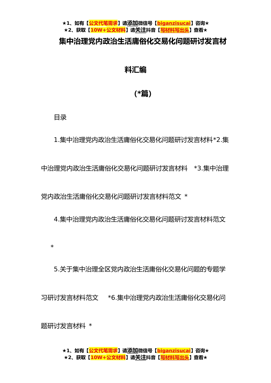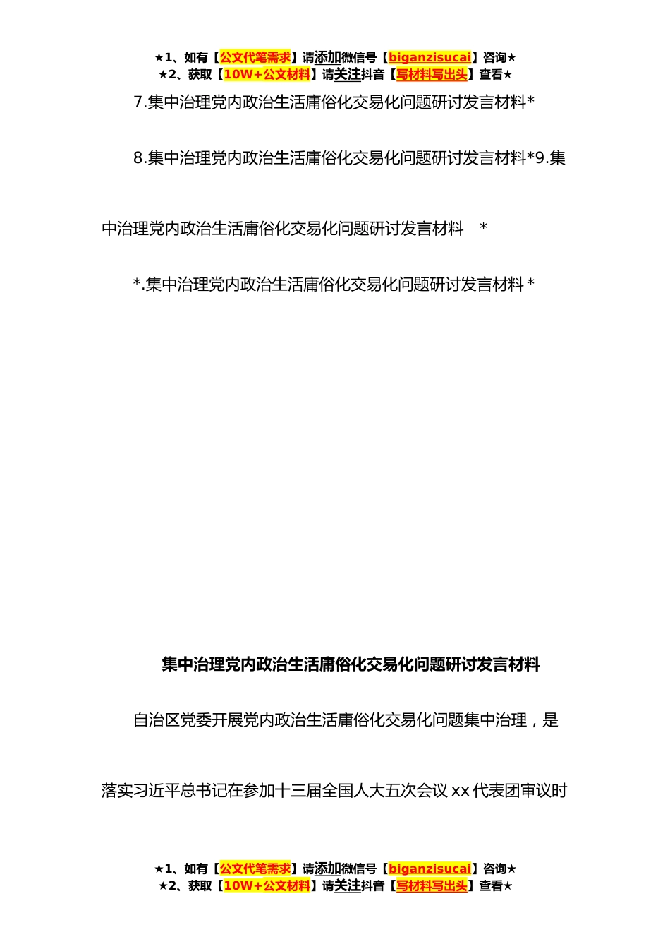 ★1、如有【公文代笔需求】请添加微信号【biganzisucai】咨询★★2、获取【10W+公文材料】请关注抖音【写材料写出头】查看★集中治理党内政治生活庸俗化交易化问题研讨发言材料汇编(*篇)目录1.集中治理党内政治生活庸俗化交易化问题研讨发言材料*2.集中治理党内政治生活庸俗化交易化问题研讨发言材料*3.集中治理党内政治生活庸俗化交易化问题研讨发言材料范文*4.集中治理党内政治生活庸俗化交易化问题研讨发言材料范文*5.关于集中治理全区党内政治生活庸俗化交易化问题的专题学习研讨发言材料范文*6.集中治理党内政治生活庸俗化交易化问题研讨发言材料*★1、如有【公文代笔需求】请添加微信号【biganzisucai】咨询★★2、获取【10W+公文材料】请关注抖音【写材料写出头】查看★★1、如有【公文代笔需求】请添加...