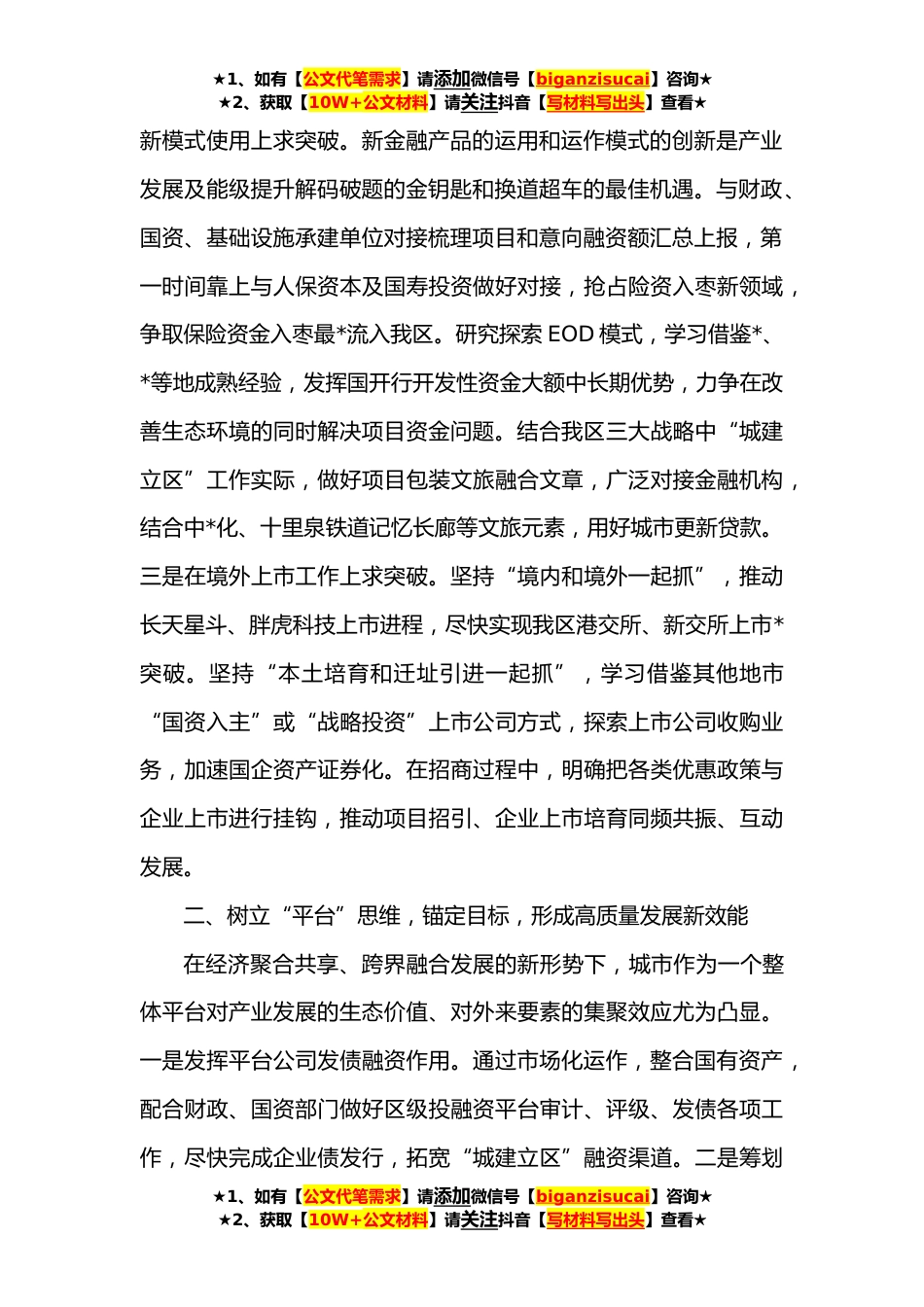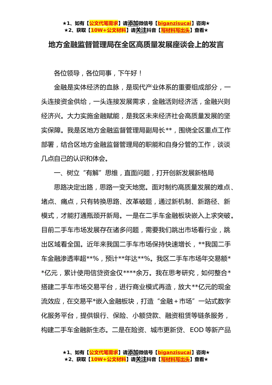 ★1、如有【公文代笔需求】请添加微信号【biganzisucai】咨询★★2、获取【10W+公文材料】请关注抖音【写材料写出头】查看★地方金融监督管理局在全区高质量发展座谈会上的发言各位领导,各位同事,下午好!金融是实体经济的血脉,是现代产业体系的重要组成部分,一头连接资金供给,一头连接发展需求,金融活则经济活,金融兴则经济兴。大力实施金融赋能,是我区未来经济社会高质量发展的坚实保障。我是区地方金融监督管理局副局长**,围绕全区重点工作部署,结合区地方金融监督管理局的职能和自身分管的工作,谈谈几点自己的认识和体会。一、树立“有解”思维,直面问题,打开创新发展新格局思路决定出路,思路一变天地宽。面对制约高质量发展的难点、堵点、痛点,只有转换思路、改革破题,通过新机制、新路径、...