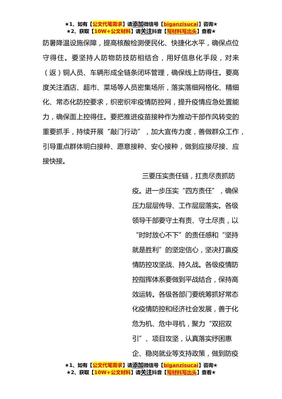 ★1、如有【公文代笔需求】请添加微信号【biganzisucai】咨询★★2、获取【10W+公文材料】请关注抖音【写材料写出头】查看★市疫情防控应急综合指挥部会议总结讲话提纲刚才,**同志汇报了全市疫情防控重点工作及相关方案,**同志分析了当前疫情防控形势、部署下步重点任务,大家要认真抓好贯彻落实。当前,疫情防控形势仍严峻复杂,外防输入风险和压力仍然较大。各地各部门要深刻、完整、全面认识党中央确定的疫情防控方针政策,绷紧思想弦,坚决克服轻视、无所谓、自以为是等思想,以慎终如始的清醒抓紧抓实常态化防疫,持续巩固来之不易的疫情防控成果。一要把握时度效,精准务实抓防疫。要因时而为,明确阶段性目标,善用发散性思维,紧盯关键时间节点,密切关注人员流动,全面排查风险隐患,制定完善预案方案...