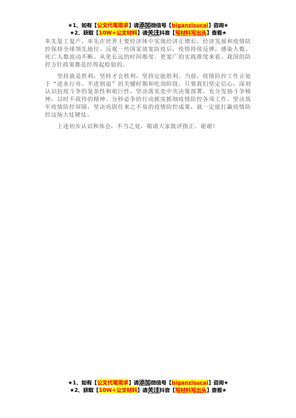 ★1、如有【公文代笔需求】请添加微信号【biganzisucai】咨询★★2、获取【10W+公文材料】请关注抖音【写材料写出头】查看★同志们:“要深刻、完整、全面认识党中央确定的疫情防控方针政策,坚决克服认识不足、准备不足、工作不足等问题,坚决克服轻视、无所谓、自以为是等思想”。**,习近平总书记主持召开中共中央政治局常务委员会会议,分析当前新冠肺炎疫情防控形势,研究部署抓紧抓实疫情防控重点工作。会议强调“始终保持清醒头脑,毫不动摇坚持‘动态清*总方针,坚决同一切歪曲、怀疑、否定我国防疫方针政策的言行作斗争”。新冠肺炎疫情发生以来,以习近平同志为核心的党中央始终坚持人民至上、生命至上,着眼大局、基于科学、把握规律,确定了“外防输入、内防反弹”总策略和“动态清*总方针,因时因势...