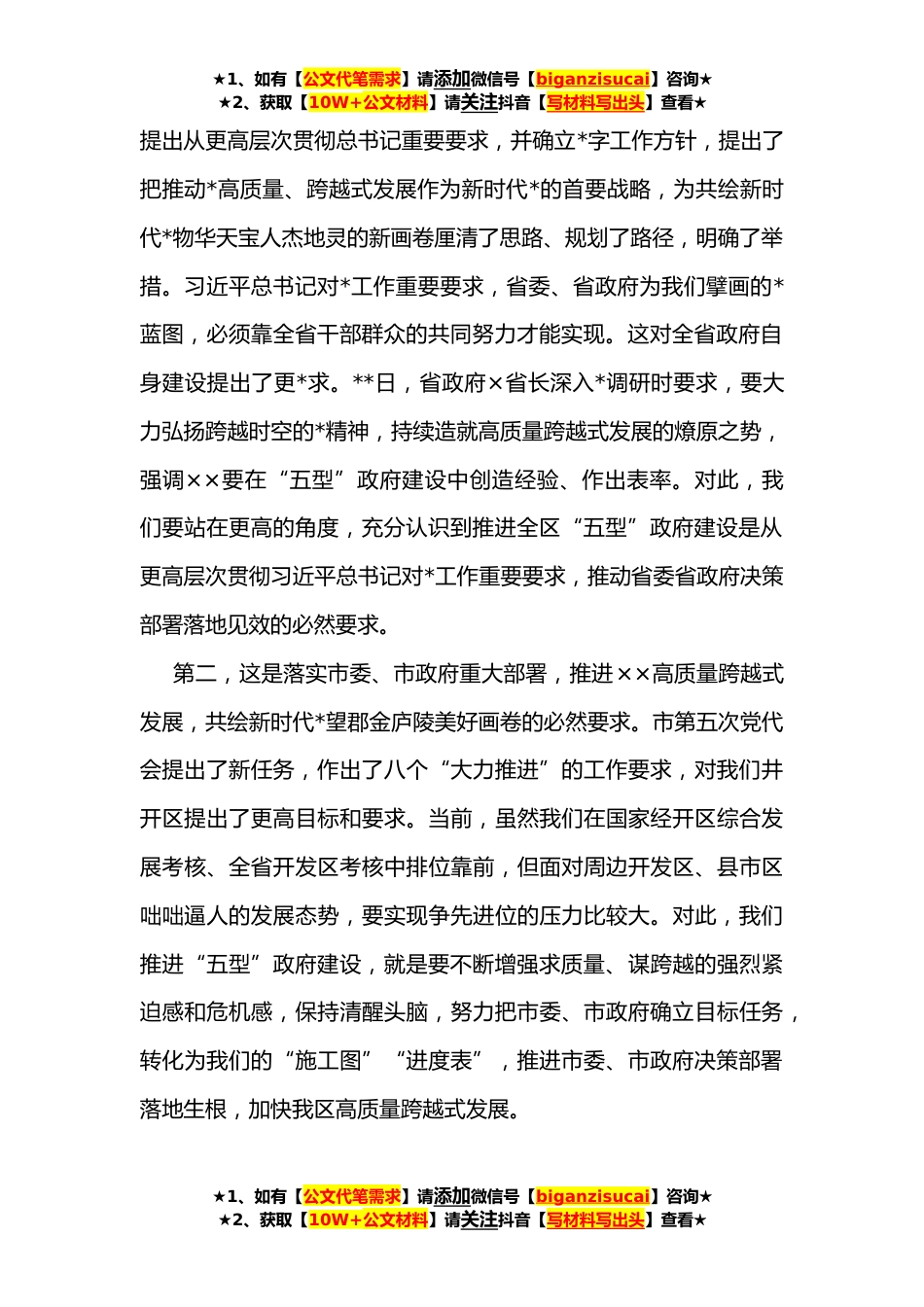 ★1、如有【公文代笔需求】请添加微信号【biganzisucai】咨询★★2、获取【10W+公文材料】请关注抖音【写材料写出头】查看★在全区“五型”政府建设动员部署会议上的讲话同志们:为贯彻落实省政府、市政府关于开展“五型”政府建设动员部署会议精神,对全区“五型”政府建设进行广泛动员和全面部署,最大力度把工作要求逐步传导,迅速形成“五型”政府建设的浓厚氛围和强大声势,经研究决定,我们今天召开全区“五型”政府建设动员部署会议。市政府高度重视“五型”政府建设工作,第一时间进行了安排部署。今天,×市长百忙之中莅会指导,既体现了市政府对贯彻落实全省“五型”政府建设行动自觉和责任担当,更是对我们抓好五型”政府建设的鼓舞和鞭策。等下,×市长、×书记将作讲话,对开展“五型”政府建设提出...
