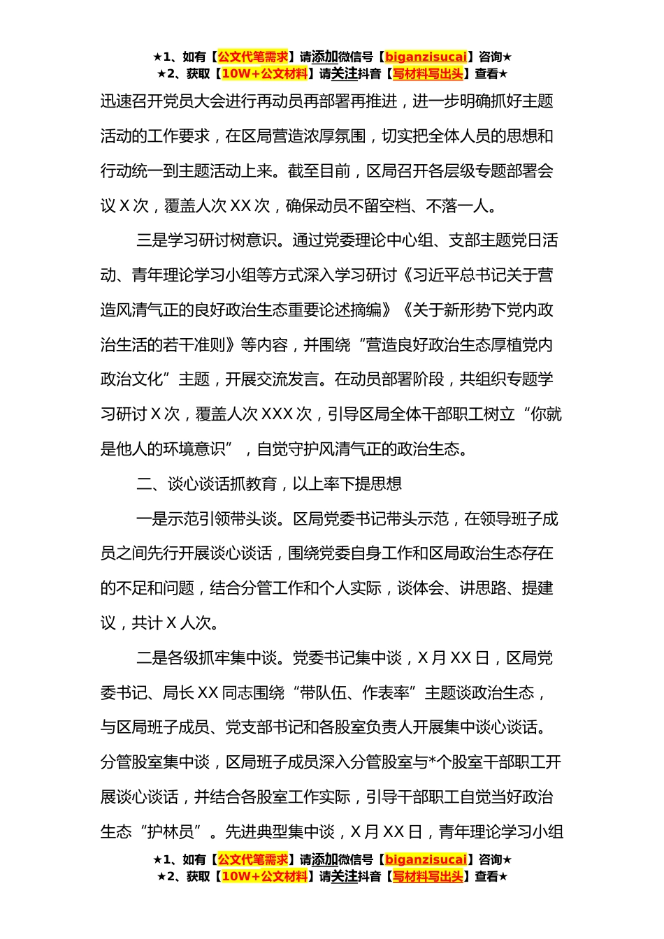 ★1、如有【公文代笔需求】请添加微信号【biganzisucai】咨询★★2、获取【10W+公文材料】请关注抖音【写材料写出头】查看★XX局委员会关于“政治生态大家谈”主题活动情况的报告市局系统党建工作科:自“政治生态大家谈”主题活动开展以来,区局党委认真贯彻落实省局、市局部署要求,以习近平新时代中国特色社会主义思想为指导,深入学习贯彻习近平总书记关于加强党的政治建设的重要论述精神,扎实推进主题活动工作,引导干部职工传承和创新党内政治文化,厚植向上向善、担当作为的良好风气。现将主题活动开展情况总结如下:一、集中精力抓部署,专题学习打基础一是周密部署作保障。主题活动启动后,区局党委高度重视,召开党委(扩大)会传达学习省局、市局动员部署会议精神,审议通过区局党建工作股提交的《国...