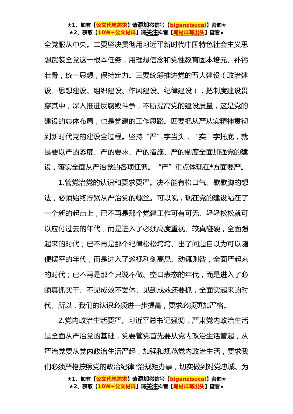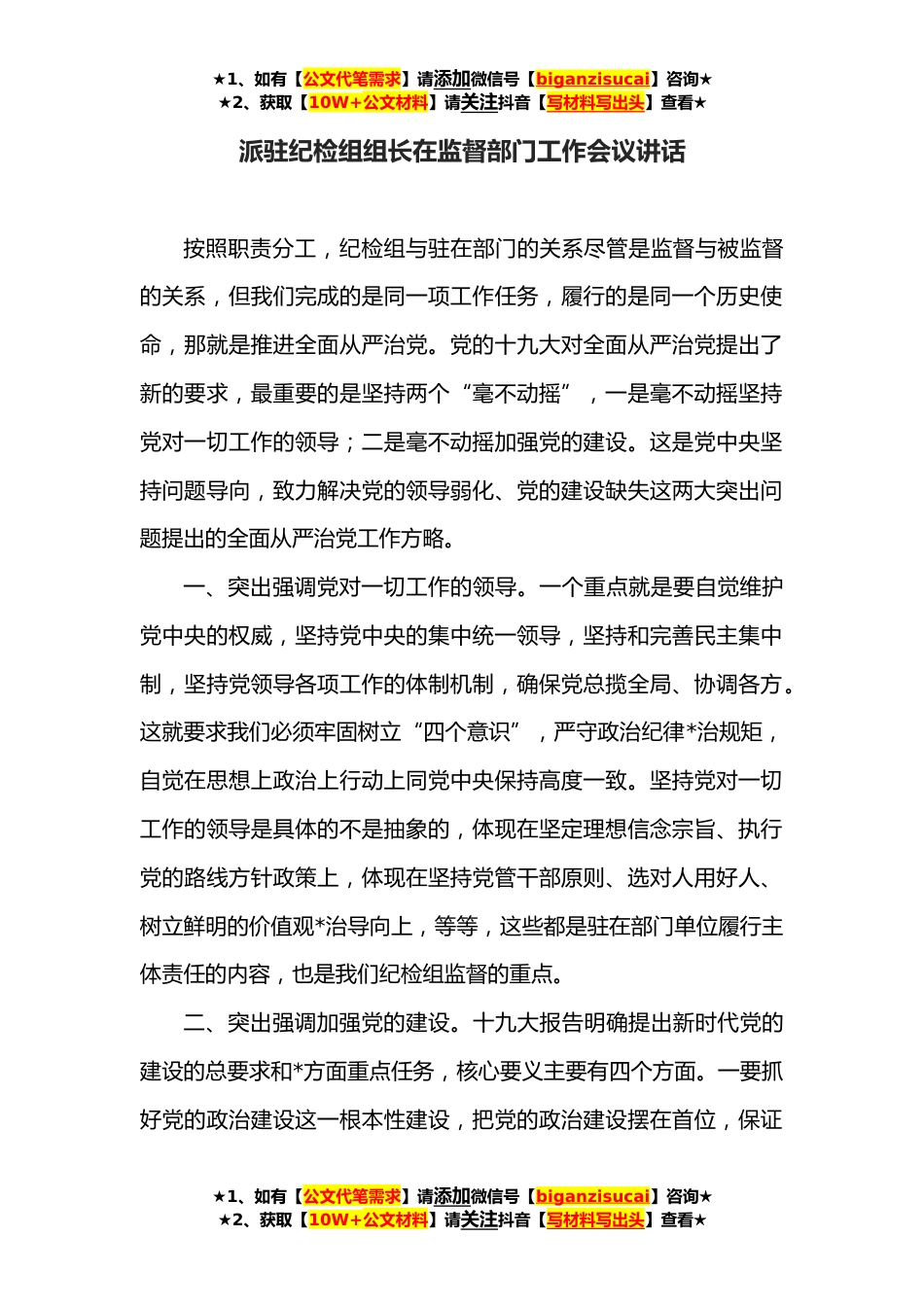 ★1、如有【公文代笔需求】请添加微信号【biganzisucai】咨询★★2、获取【10W+公文材料】请关注抖音【写材料写出头】查看★派驻纪检组组长在监督部门工作会议讲话按照职责分工,纪检组与驻在部门的关系尽管是监督与被监督的关系,但我们完成的是同一项工作任务,履行的是同一个历史使命,那就是推进全面从严治党。党的十九大对全面从严治党提出了新的要求,最重要的是坚持两个“毫不动摇”,一是毫不动摇坚持党对一切工作的领导;二是毫不动摇加强党的建设。这是党中央坚持问题导向,致力解决党的领导弱化、党的建设缺失这两大突出问题提出的全面从严治党工作方略。一、突出强调党对一切工作的领导。一个重点就是要自觉维护党中央的权威,坚持党中央的集中统一领导,坚持和完善民主集中制,坚持党领导各项工作的...
