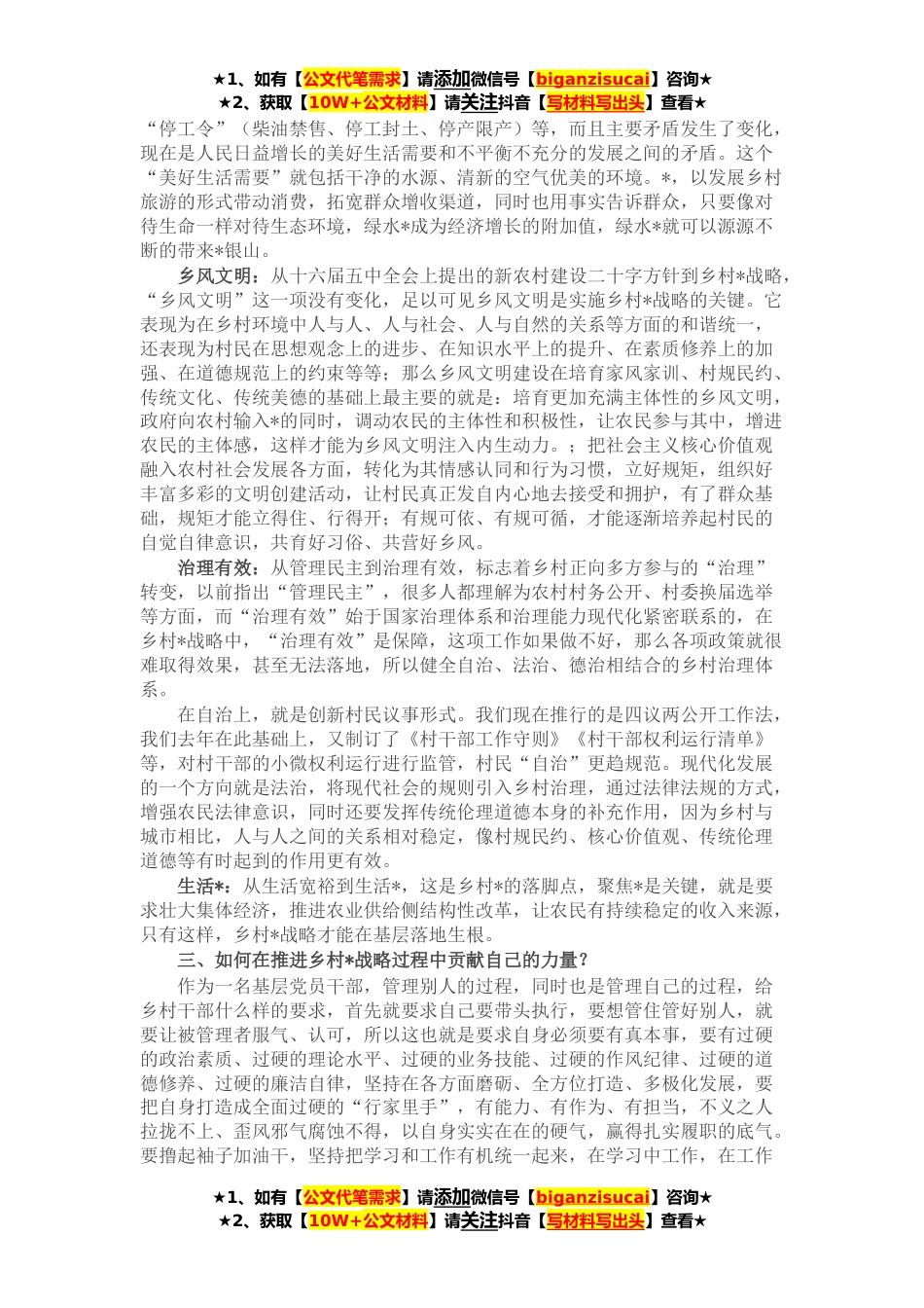 ★1、如有【公文代笔需求】请添加微信号【biganzisucai】咨询★★2、获取【10W+公文材料】请关注抖音【写材料写出头】查看★各位领导、各位学员:大家好,我有幸参加这次推进乡村*战略培训会,在紧张与充实的学习中,我不仅切身感受到了实施乡村*战略的热度和深度,而且*离地倾听了多位学者教授的高端讲座和最新理论成果,收获了接地气有特色的乡村*实践经验,获益颇丰。今天我就借这个机会跟各位领导和学员们交流一下个人的一些学习心得和体会。一、如何使脱贫攻坚和乡村*有效衔接?既然使用了“*”这个词,那就说明了乡村曾经存在的辉煌和成就。以一些偏远乡镇为例,每年均有半数以上的青壮劳动力离开农村到城市打工,农村的空壳化和老龄化日趋严重,即使是农村人口也在缓慢增长,但活力却越来越小,城乡之间的...