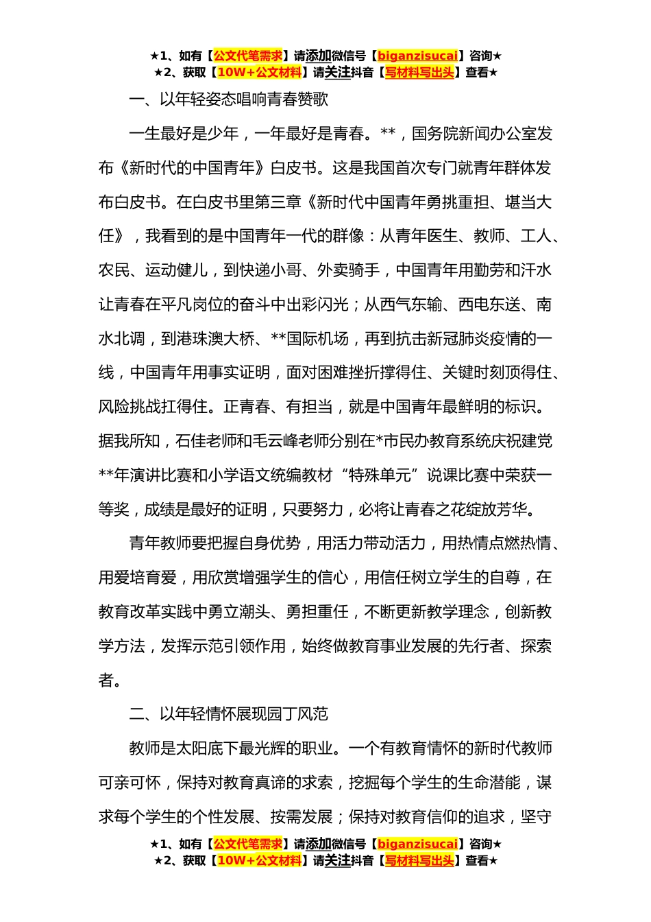 ★1、如有【公文代笔需求】请添加微信号【biganzisucai】咨询★★2、获取【10W+公文材料】请关注抖音【写材料写出头】查看★团县委书记在小学第七届年轻节大会上的讲话各位老师,青年朋友们:大家上午好!明媚五月,立夏今至,万物风华翠茂,一切恰到好处。在这个属于年轻人的高光时刻里,有幸应邀到*小学参加第七届年轻节,深感荣幸、倍感珍惜!立夏之日,炎暑将至万物长,阳*媚且张扬。立校之日,*悠悠上下求索,立德树人生生不息。在此,我谨代表团县委向*小学第七届年轻节开幕表示热烈祝贺!也借此机会,向长期以来关心支持团县委工作的各位领导和老师们表示衷心的感谢!向全校青年教师致以节日的问候*好的祝愿。年轻节,不仅是一个节日,更是一种积极向上的态度。初进校园,楼宇雅净、书声朗朗、弦歌悠扬;走...