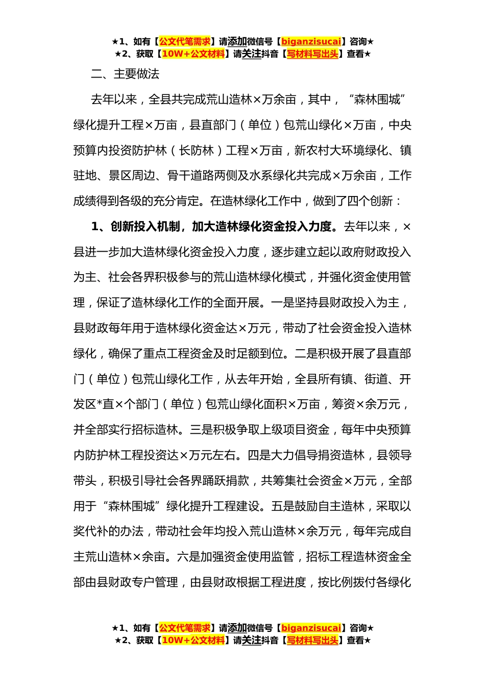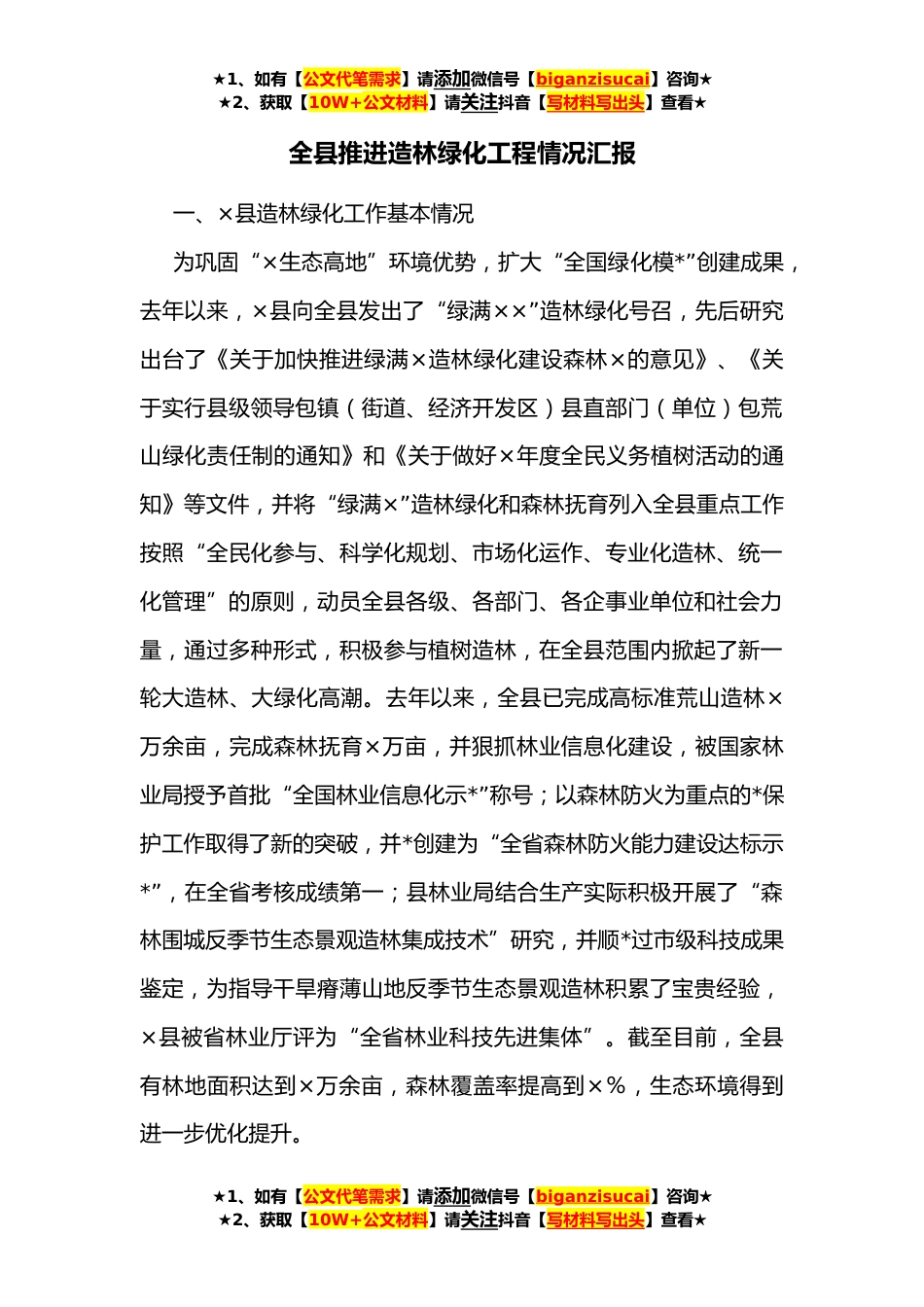 ★1、如有【公文代笔需求】请添加微信号【biganzisucai】咨询★★2、获取【10W+公文材料】请关注抖音【写材料写出头】查看★全县推进造林绿化工程情况汇报一、×县造林绿化工作基本情况为巩固“×生态高地”环境优势,扩大“全国绿化模*”创建成果,去年以来,×县向全县发出了“绿满××”造林绿化号召,先后研究出台了《关于加快推进绿满×造林绿化建设森林×的意见》、《关于实行县级领导包镇(街道、经济开发区)县直部门(单位)包荒山绿化责任制的通知》和《关于做好×年度全民义务植树活动的通知》等文件,并将“绿满×”造林绿化和森林抚育列入全县重点工作按照“全民化参与、科学化规划、市场化运作、专业化造林、统一化管理”的原则,动员全县各级、各部门、各企事业单位和社会力量,通过多种形式,积极...