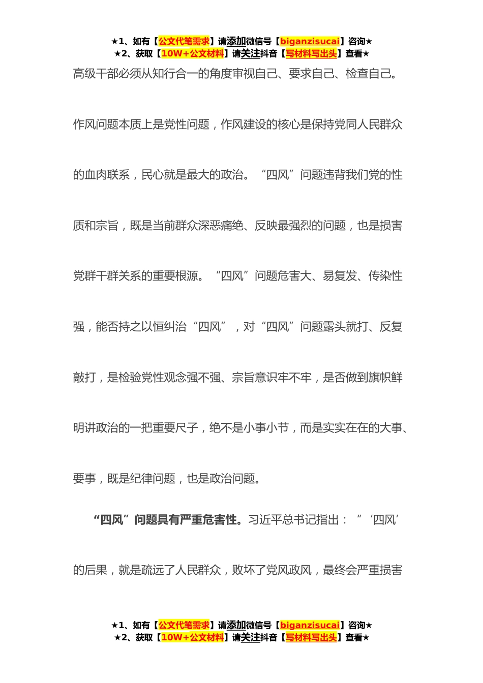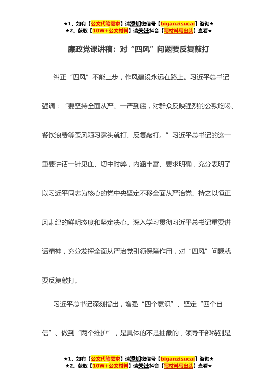 ★1、如有【公文代笔需求】请添加微信号【biganzisucai】咨询★★2、获取【10W+公文材料】请关注抖音【写材料写出头】查看★廉政党课讲稿:对“四风”问题要反复敲打纠正“四风”不能止步,作风建设永远在路上。习近平总书记强调:“要坚持全面从严、一严到底,对群众反映强烈的公款吃喝、餐饮浪费等歪风陋习露头就打、反复敲打。”习近平总书记的这一重要讲话一针见血、切中时弊,内涵丰富、要求明确,充分表明了以习近平同志为核心的党中央坚定不移全面从严治党、持之以恒正风肃纪的鲜明态度和坚定决心。深入学习贯彻习近平总书记重要讲话精神,充分发挥全面从严治党引领保障作用,对“四风”问题就要反复敲打。习近平总书记深刻指出,增强“四个意识”、坚定“四个自信”、做到“两个维护”,是具体的不是抽象...