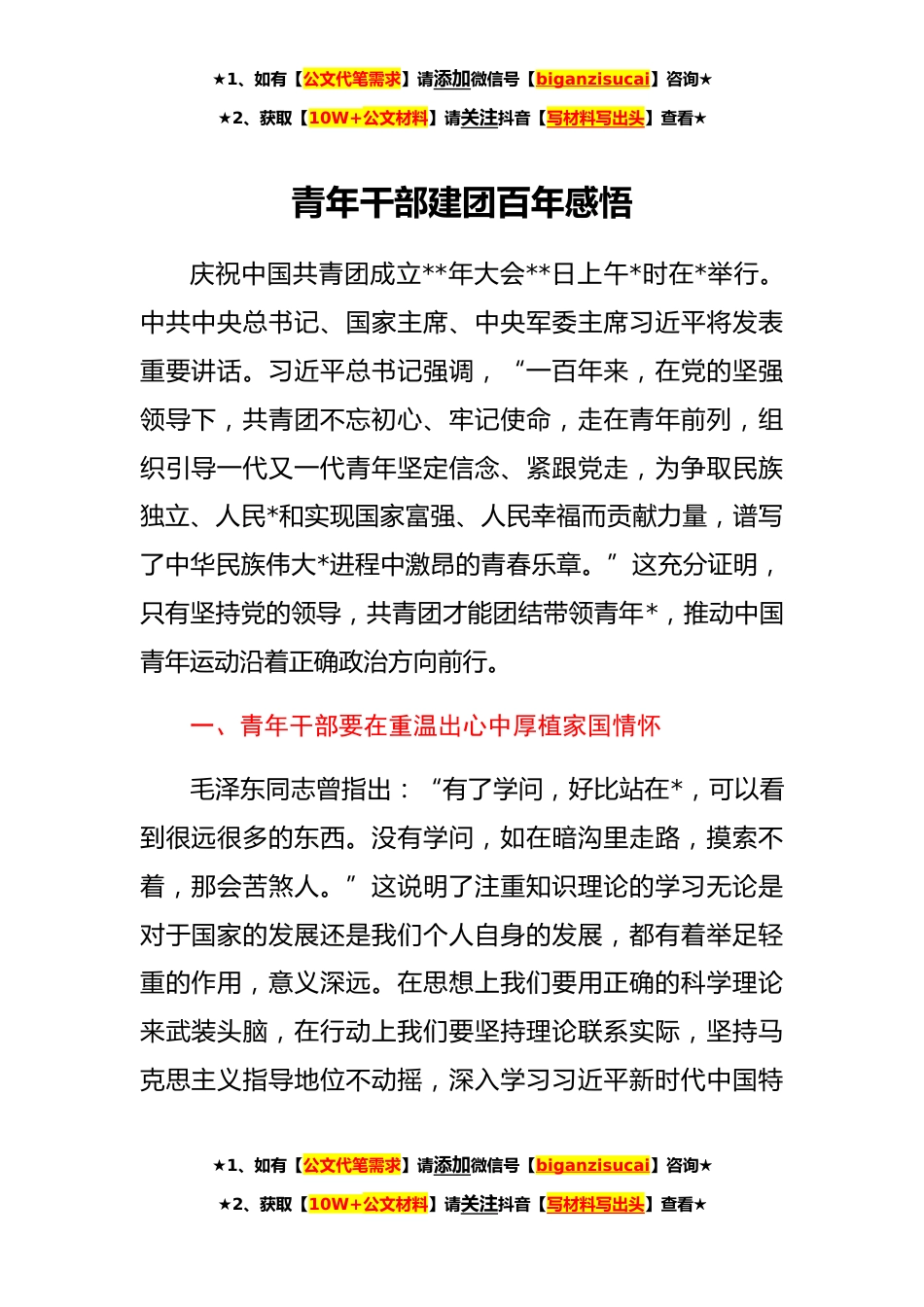 ★1、如有【公文代笔需求】请添加微信号【biganzisucai】咨询★★2、获取【10W+公文材料】请关注抖音【写材料写出头】查看★青年干部建团百年感悟庆祝中国共青团成立**年大会**日上午*时在*举行。中共中央总书记、国家主席、中央军委主席习近平将发表重要讲话。习近平总书记强调,“一百年来,在党的坚强领导下,共青团不忘初心、牢记使命,走在青年前列,组织引导一代又一代青年坚定信念、紧跟党走,为争取民族独立、人民*和实现国家富强、人民幸福而贡献力量,谱写了中华民族伟大*进程中激昂的青春乐章。”这充分证明,只有坚持党的领导,共青团才能团结带领青年*,推动中国青年运动沿着正确政治方向前行。一、青年干部要在重温出心中厚植家国情怀毛泽东同志曾指出:“有了学问,好比站在*,可以看到很远很多的...