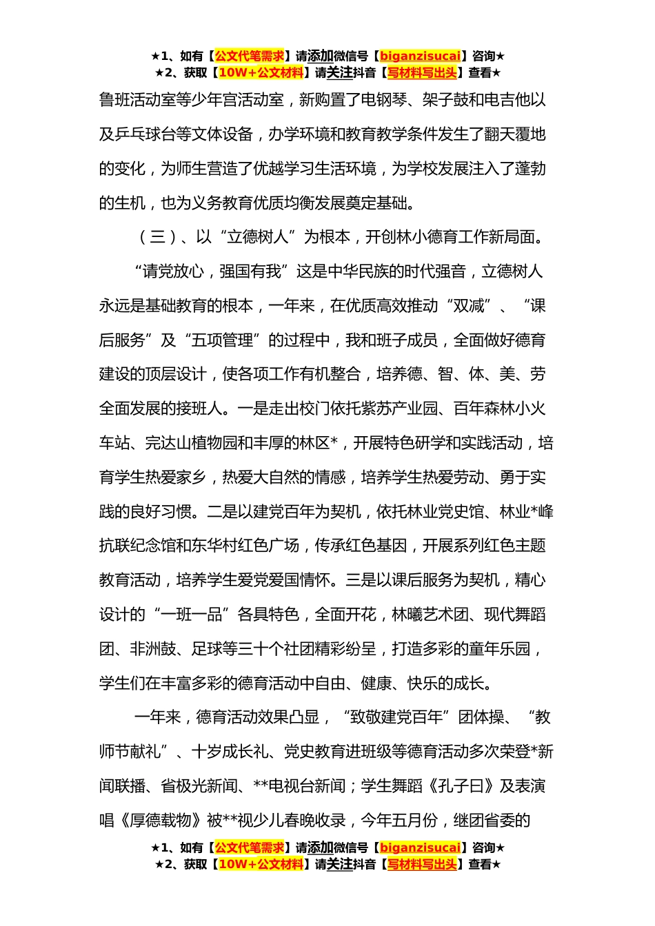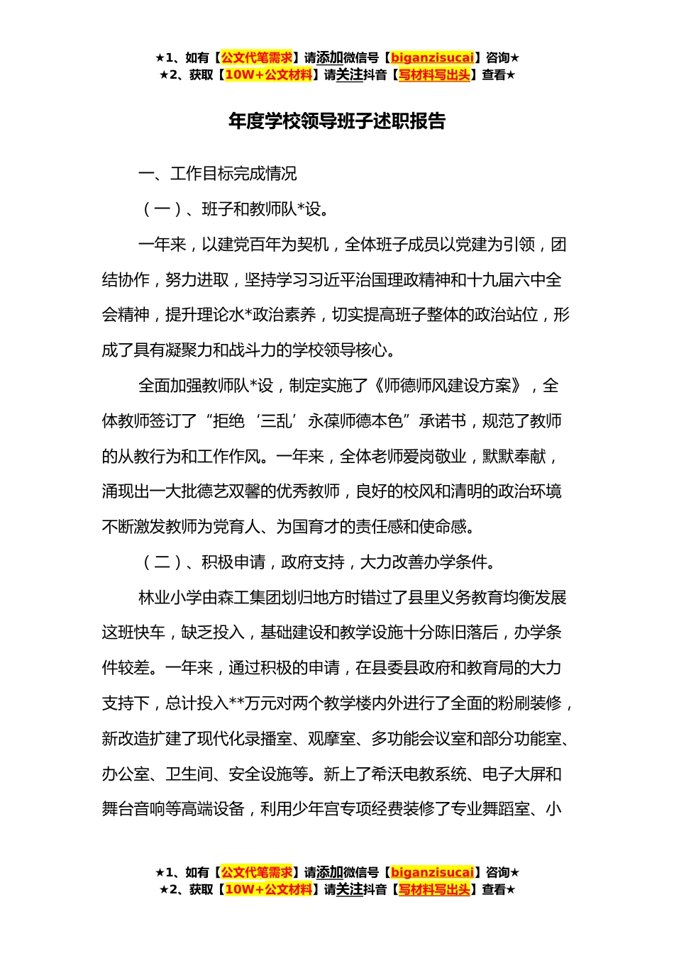★1、如有【公文代笔需求】请添加微信号【biganzisucai】咨询★★2、获取【10W+公文材料】请关注抖音【写材料写出头】查看★年度学校领导班子述职报告一、工作目标完成情况(一)、班子和教师队*设。一年来,以建党百年为契机,全体班子成员以党建为引领,团结协作,努力进取,坚持学习习近平治国理政精神和十九届六中全会精神,提升理论水*政治素养,切实提高班子整体的政治站位,形成了具有凝聚力和战斗力的学校领导核心。全面加强教师队*设,制定实施了《师德师风建设方案》,全体教师签订了“拒绝‘三乱’永葆师德本色”承诺书,规范了教师的从教行为和工作作风。一年来,全体老师爱岗敬业,默默奉献,涌现出一大批德艺双馨的优秀教师,良好的校风和清明的政治环境不断激发教师为党育人、为国育才的责任感和使...