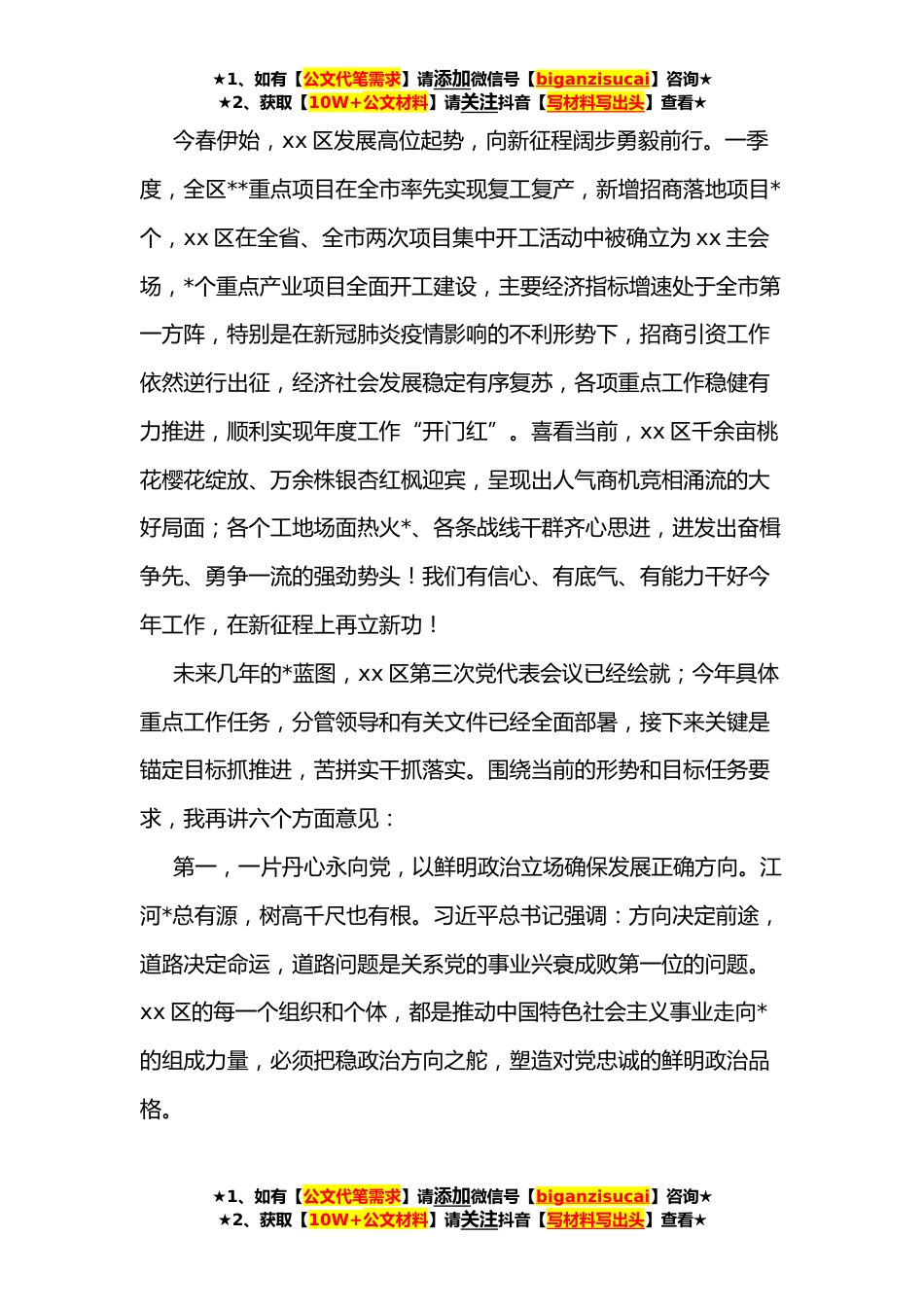 ★1、如有【公文代笔需求】请添加微信号【biganzisucai】咨询★★2、获取【10W+公文材料】请关注抖音【写材料写出头】查看★在xx区**年全面从严治党暨经济工作会上的讲话同志们:在市第五次党代会和“两会”刚刚胜利闭幕之际,我们顺势而为、乘势而上,迅速召开xx区全面从严治党暨经济工作会,大会的主题是:以习近平新时代中国特色社会主义思想为指导,深入学习贯彻习近平总书记来陕考察重要讲话重要指示,紧扣市委、市政府对xx区“三区”建设定位,聚焦产城绿,突出高精尖,奋力推进xx区各项事业再谱新篇,以高质量发展成效为加快建成西北生态经济强市和聚力建设幸福xx贡献xx力量!过去一年,xx区克服困难挑战,在逆境中闯出新的辉煌。面对资金短缺、市场疲软、疫情冲击和遗留问题多重交织的发展形势,我们坚定...