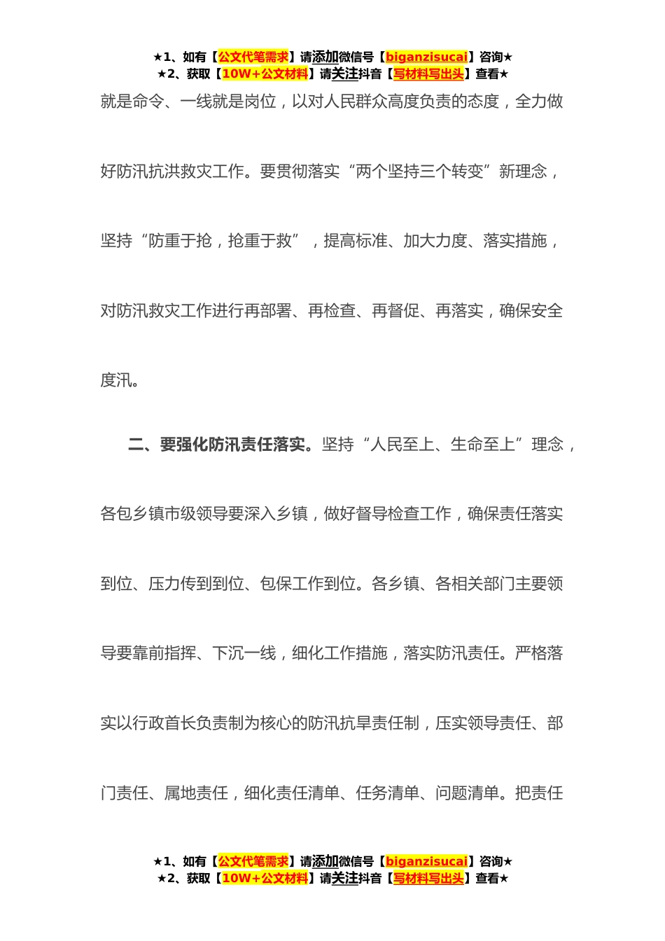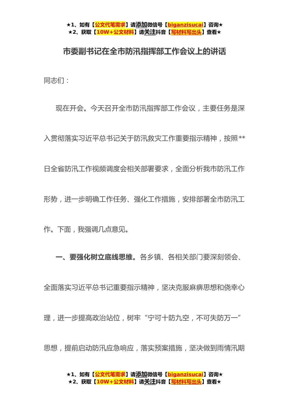 ★1、如有【公文代笔需求】请添加微信号【biganzisucai】咨询★★2、获取【10W+公文材料】请关注抖音【写材料写出头】查看★市委副书记在全市防汛指挥部工作会议上的讲话同志们:现在开会。今天召开全市防汛指挥部工作会议,主要任务是深入贯彻落实习近平总书记关于防汛救灾工作重要指示精神,按照**日全省防汛工作视频调度会相关部署要求,全面分析我市防汛工作形势,进一步明确工作任务、强化工作措施,安排部署全市防汛工作。下面,我强调几点意见。一、要强化树立底线思维。各乡镇、各相关部门要深刻领会、全面落实习近平总书记重要指示精神,坚决克服麻痹思想和侥幸心理,进一步提高政治站位,树牢“宁可十防九空,不可失防万一”思想,提前启动防汛应急响应,落实预案措施,坚决做到雨情汛期★1、如有【公文...