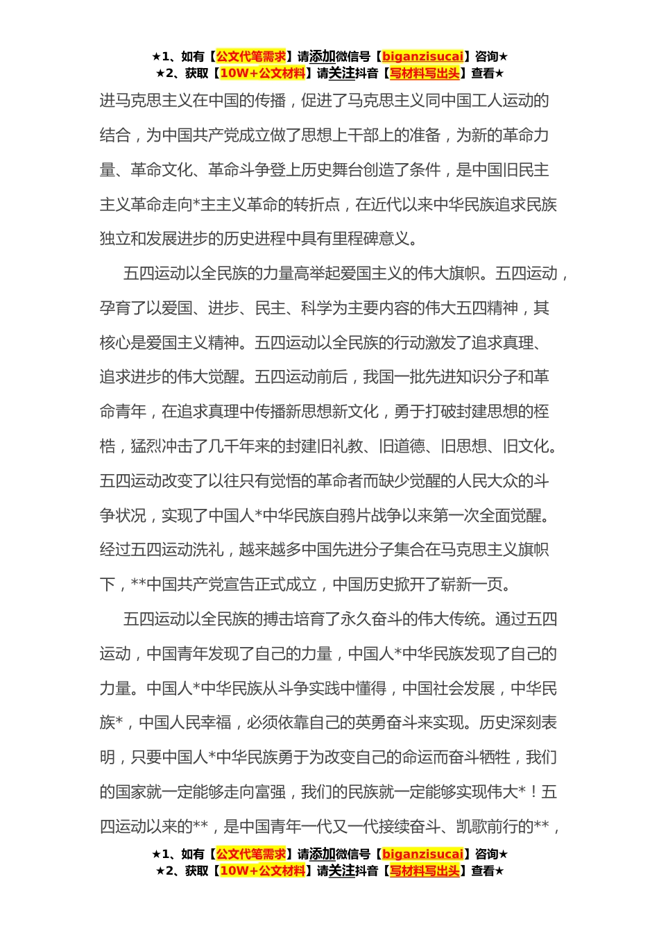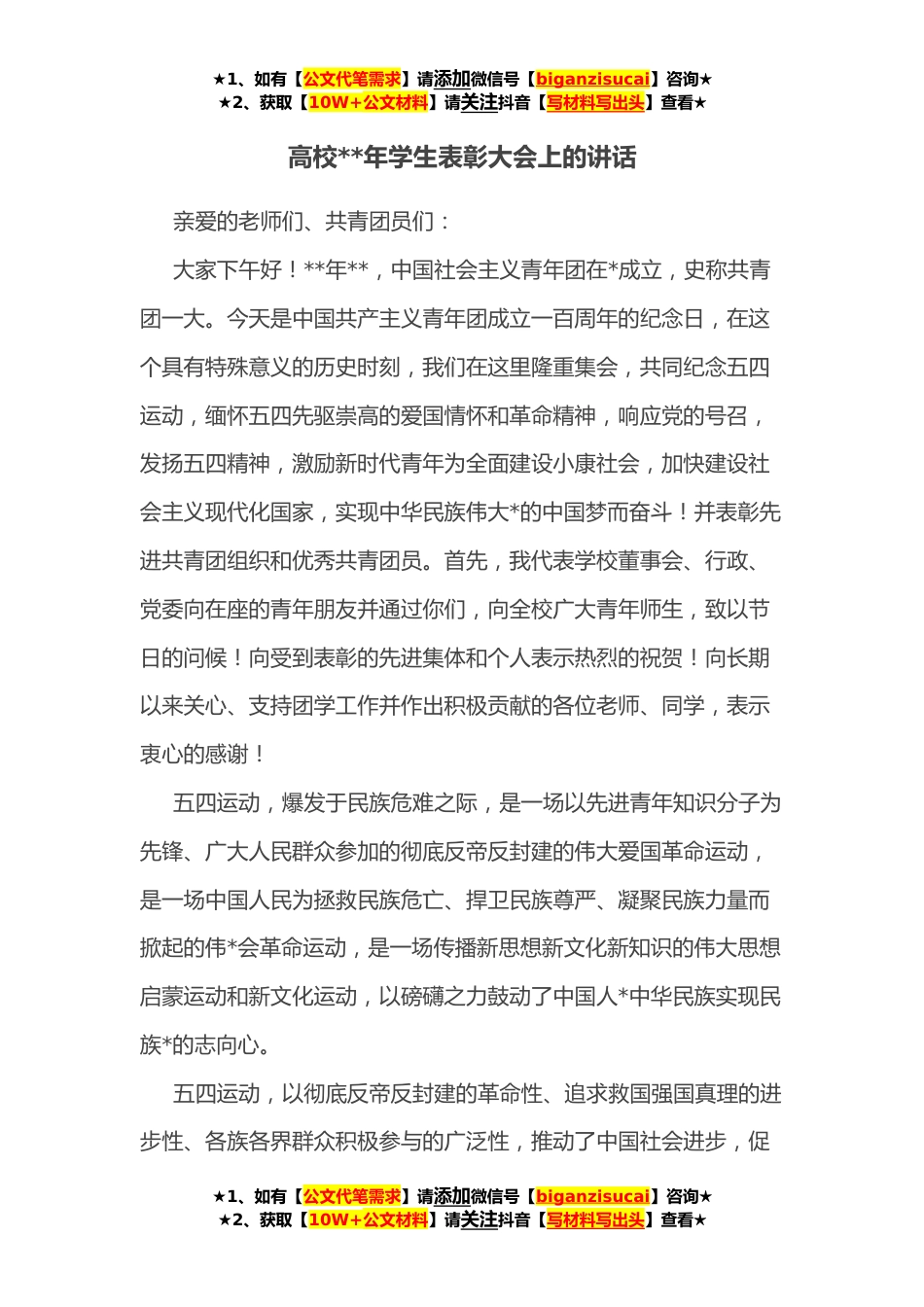 ★1、如有【公文代笔需求】请添加微信号【biganzisucai】咨询★★2、获取【10W+公文材料】请关注抖音【写材料写出头】查看★高校**年学生表彰大会上的讲话亲爱的老师们、共青团员们:大家下午好!**年**,中国社会主义青年团在*成立,史称共青团一大。今天是中国共产主义青年团成立一百周年的纪念日,在这个具有特殊意义的历史时刻,我们在这里隆重集会,共同纪念五四运动,缅怀五四先驱崇高的爱国情怀和革命精神,响应党的号召,发扬五四精神,激励新时代青年为全面建设小康社会,加快建设社会主义现代化国家,实现中华民族伟大*的中国梦而奋斗!并表彰先进共青团组织和优秀共青团员。首先,我代表学校董事会、行政、党委向在座的青年朋友并通过你们,向全校广大青年师生,致以节日的问候!向受到表彰的先进集体...