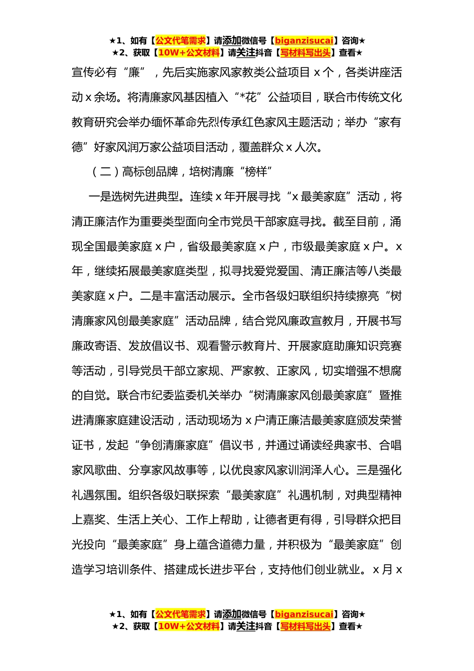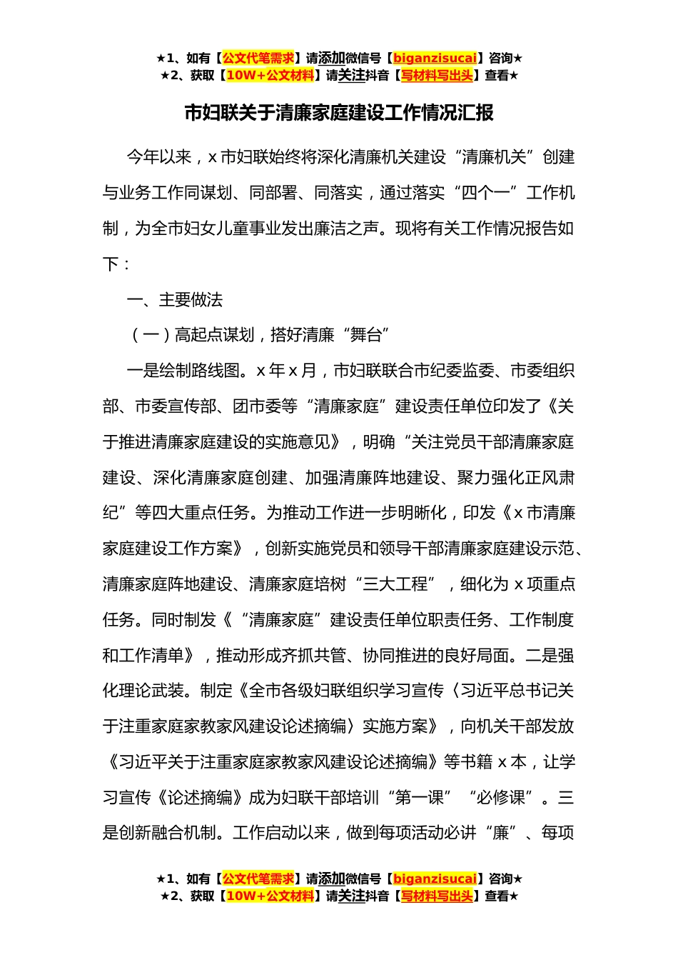 ★1、如有【公文代笔需求】请添加微信号【biganzisucai】咨询★★2、获取【10W+公文材料】请关注抖音【写材料写出头】查看★市妇联关于清廉家庭建设工作情况汇报今年以来,x市妇联始终将深化清廉机关建设“清廉机关”创建与业务工作同谋划、同部署、同落实,通过落实“四个一”工作机制,为全市妇女儿童事业发出廉洁之声。现将有关工作情况报告如下:一、主要做法(一)高起点谋划,搭好清廉“舞台”一是绘制路线图。x年x月,市妇联联合市纪委监委、市委组织部、市委宣传部、团市委等“清廉家庭”建设责任单位印发了《关于推进清廉家庭建设的实施意见》,明确“关注党员干部清廉家庭建设、深化清廉家庭创建、加强清廉阵地建设、聚力强化正风肃纪”等四大重点任务。为推动工作进一步明晰化,印发《x市清廉家庭建设...