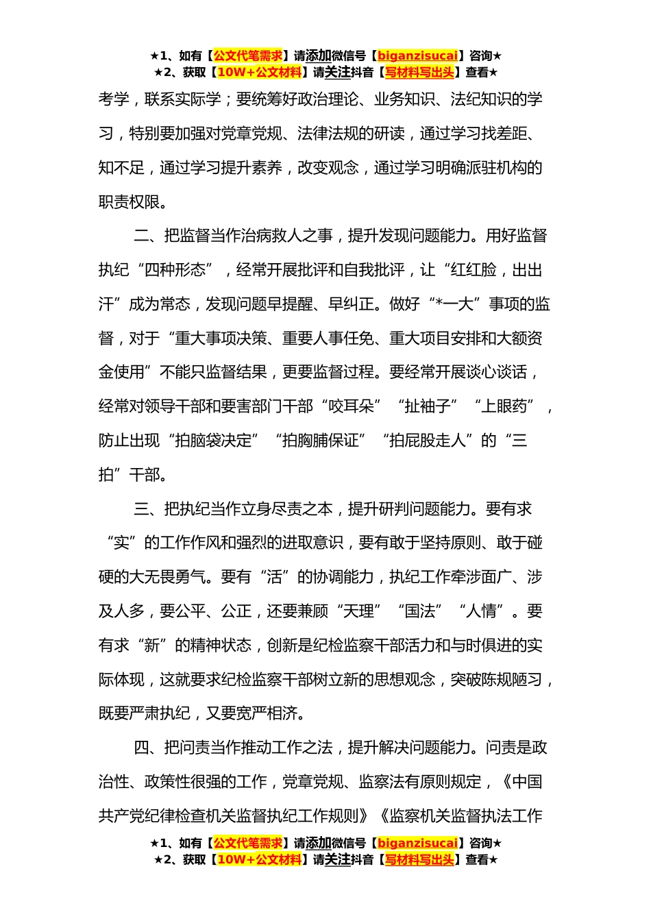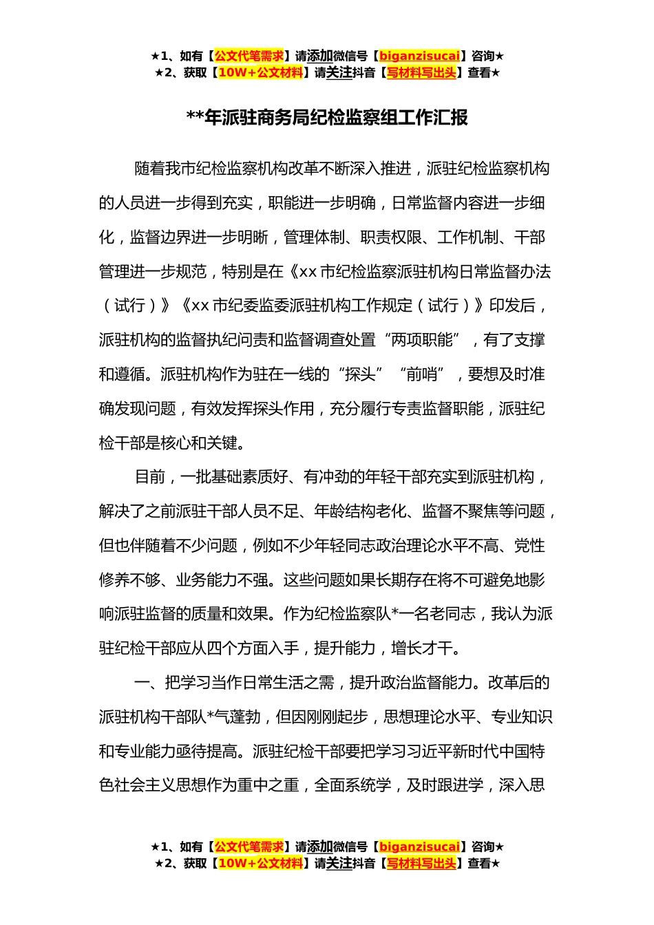 ★1、如有【公文代笔需求】请添加微信号【biganzisucai】咨询★★2、获取【10W+公文材料】请关注抖音【写材料写出头】查看★**年派驻商务局纪检监察组工作汇报随着我市纪检监察机构改革不断深入推进,派驻纪检监察机构的人员进一步得到充实,职能进一步明确,日常监督内容进一步细化,监督边界进一步明晰,管理体制、职责权限、工作机制、干部管理进一步规范,特别是在《xx市纪检监察派驻机构日常监督办法(试行)》《xx市纪委监委派驻机构工作规定(试行)》印发后,派驻机构的监督执纪问责和监督调查处置“两项职能”,有了支撑和遵循。派驻机构作为驻在一线的“探头”“前哨”,要想及时准确发现问题,有效发挥探头作用,充分履行专责监督职能,派驻纪检干部是核心和关键。目前,一批基础素质好、有冲劲的年轻...