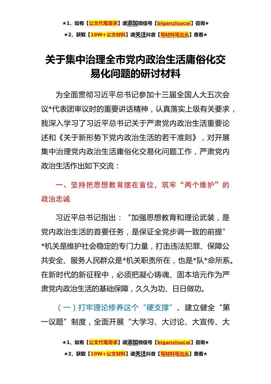 ★1、如有【公文代笔需求】请添加微信号【biganzisucai】咨询★★2、获取【10W+公文材料】请关注抖音【写材料写出头】查看★关于集中治理全市党内政治生活庸俗化交易化问题的研讨材料为全面贯彻习近平总书记参加十三届全国人大五次会议*代表团审议时的重要讲话精神,认真落实上级有关要求,我深入学习了习近平总书记关于严肃党内政治生活重要论述和《关于新形势下党内政治生活的若干准则》,对开展集中治理党内政治生活庸俗化交易化问题工作,严肃党内政治生活作出如下交流:一、坚持把思想教育摆在首位,筑牢“两个维护”的政治忠诚习近平总书记指出:“加强思想教育和理论武装,是党内政治生活的首要任务,是保证全党步调一致的前提”*机关是维护社会稳定的专门力量,打击违法犯罪、保障公共安全、服务人民群众...