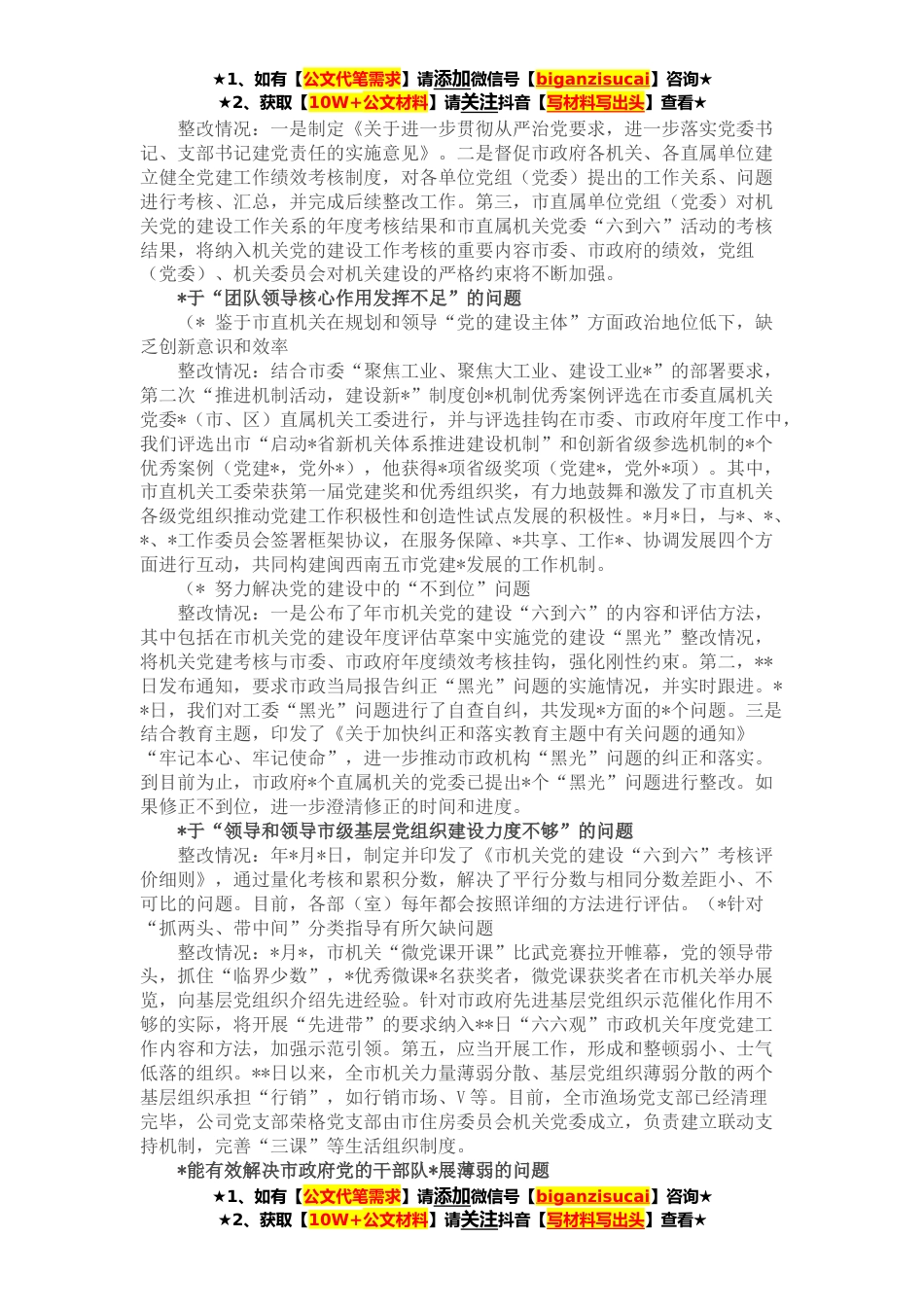 ★1、如有【公文代笔需求】请添加微信号【biganzisucai】咨询★★2、获取【10W+公文材料】请关注抖音【写材料写出头】查看★根据市委巡察工作统一部署,年月日至月日,市委巡察三组对中共市直机关工委开展了巡察,并于年月日反馈了巡察意见。现将巡察整改情况报告如下。一、把巡视整改作为一项重要的政治任务,高度重视(*增强政治意识和思想意识。**日,市委三个检查组将检查情况反馈工委后,工委指导小组立即召开了第一次检查整改专项会议,对市委检查反馈中存在的问题进行了分析和深入反思,有效地提高了党员干部特别是高级干部的政治觉悟,做好检查整改工作。年*月*日,市委常委、市直机关组织部部长、工委书记批示并提出要求,要求工委抓好检查整改工作。工委迅速召开(扩大)工委会议,及时组织党员干部进行...
