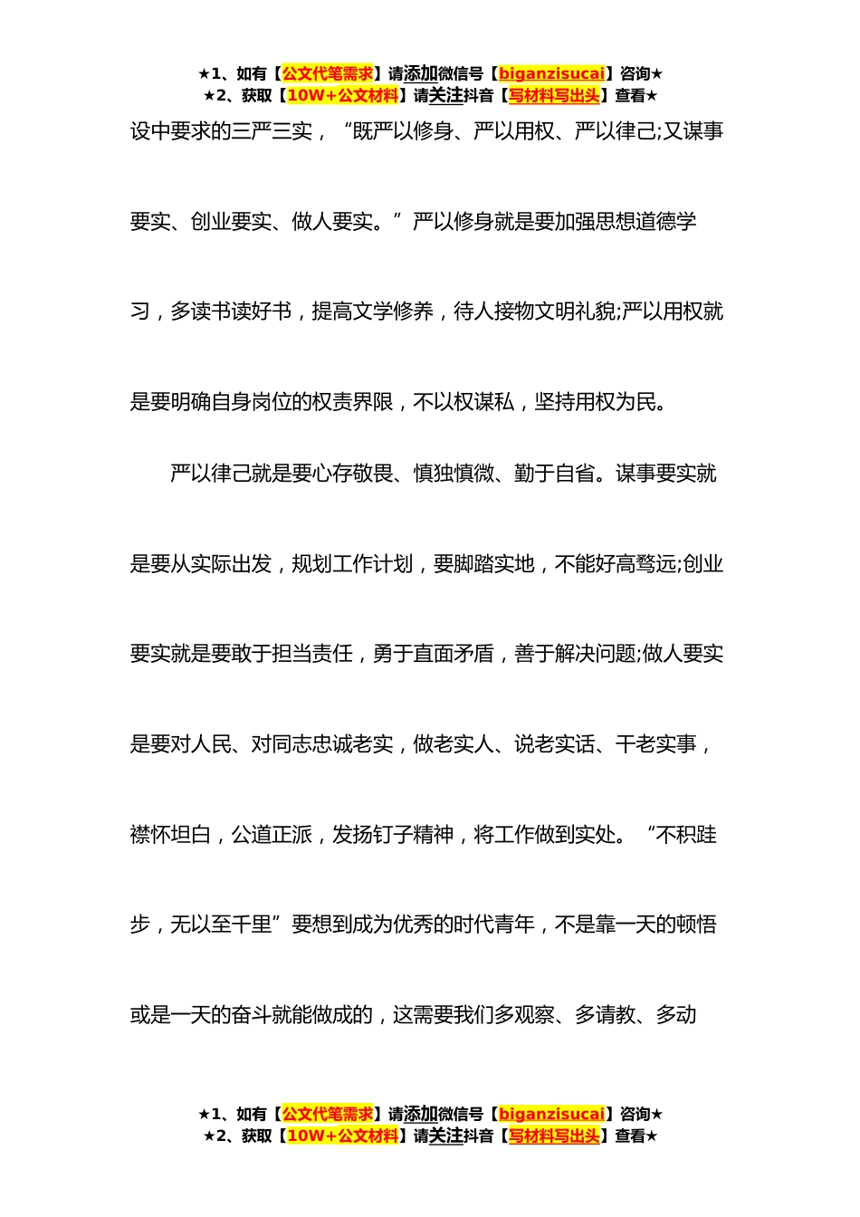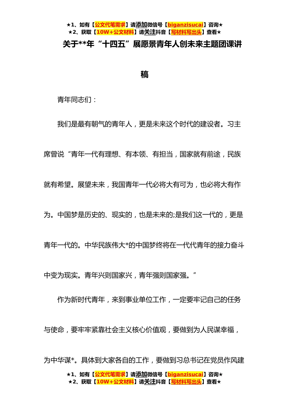 ★1、如有【公文代笔需求】请添加微信号【biganzisucai】咨询★★2、获取【10W+公文材料】请关注抖音【写材料写出头】查看★关于**年“十四五”展愿景青年人创未来主题团课讲稿青年同志们:我们是最有朝气的青年人,更是未来这个时代的建设者。习主席曾说“青年一代有理想、有本领、有担当,国家就有前途,民族就有希望。展望未来,我国青年一代必将大有可为,也必将大有作为。中国梦是历史的、现实的,也是未来的;是我们这一代的,更是青年一代的。中华民族伟大*的中国梦终将在一代代青年的接力奋斗中变为现实。青年兴则国家兴,青年强则国家强。”作为新时代青年,来到事业单位工作,一定要牢记自己的任务与使命,要牢牢紧靠社会主义核心价值观,要做到为人民谋幸福,为中华谋*。具体到大家各自的工作,要做到习...