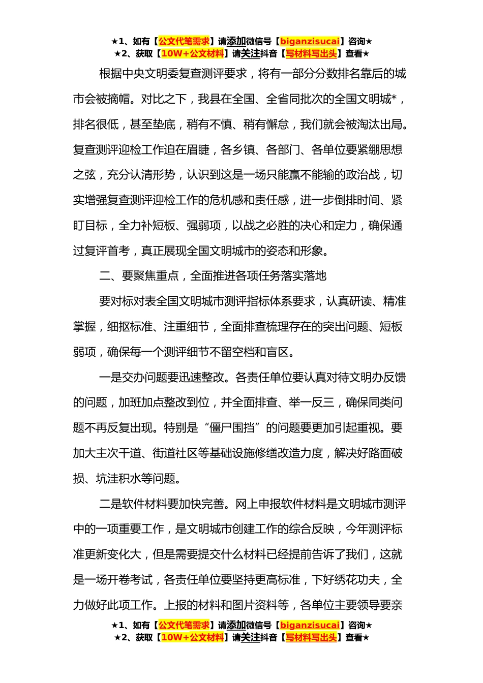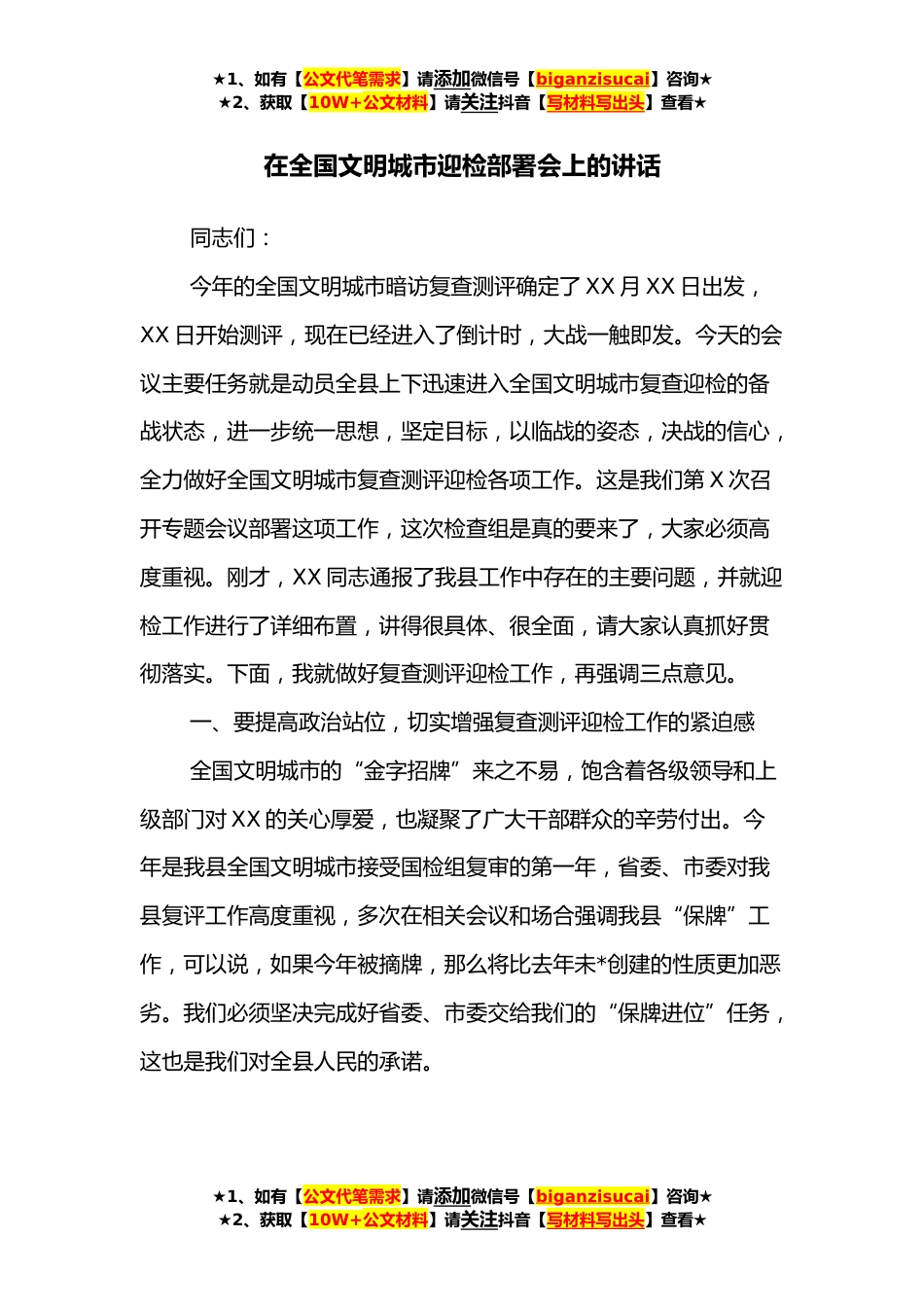 ★1、如有【公文代笔需求】请添加微信号【biganzisucai】咨询★★2、获取【10W+公文材料】请关注抖音【写材料写出头】查看★在全国文明城市迎检部署会上的讲话同志们:今年的全国文明城市暗访复查测评确定了XX月XX日出发,XX日开始测评,现在已经进入了倒计时,大战一触即发。今天的会议主要任务就是动员全县上下迅速进入全国文明城市复查迎检的备战状态,进一步统一思想,坚定目标,以临战的姿态,决战的信心,全力做好全国文明城市复查测评迎检各项工作。这是我们第X次召开专题会议部署这项工作,这次检查组是真的要来了,大家必须高度重视。刚才,XX同志通报了我县工作中存在的主要问题,并就迎检工作进行了详细布置,讲得很具体、很全面,请大家认真抓好贯彻落实。下面,我就做好复查测评迎检工作,再强调三点...