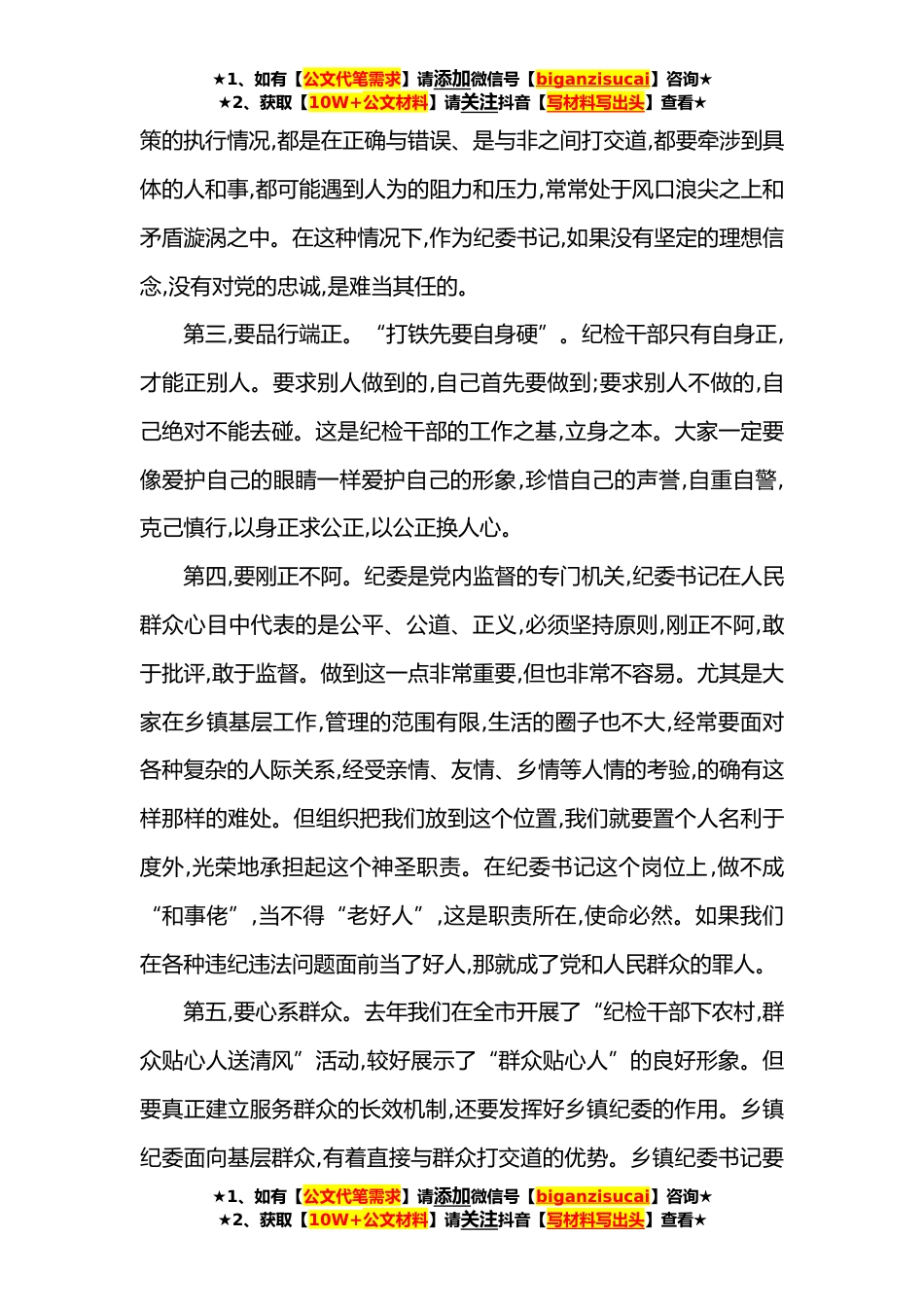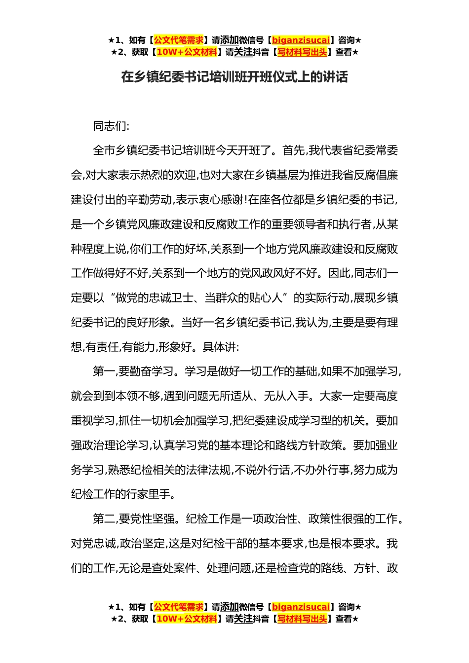 ★1、如有【公文代笔需求】请添加微信号【biganzisucai】咨询★★2、获取【10W+公文材料】请关注抖音【写材料写出头】查看★在乡镇纪委书记培训班开班仪式上的讲话同志们:全市乡镇纪委书记培训班今天开班了。首先,我代表省纪委常委会,对大家表示热烈的欢迎,也对大家在乡镇基层为推进我省反腐倡廉建设付出的辛勤劳动,表示衷心感谢!在座各位都是乡镇纪委的书记,是一个乡镇党风廉政建设和反腐败工作的重要领导者和执行者,从某种程度上说,你们工作的好坏,关系到一个地方党风廉政建设和反腐败工作做得好不好,关系到一个地方的党风政风好不好。因此,同志们一定要以“做党的忠诚卫士、当群众的贴心人”的实际行动,展现乡镇纪委书记的良好形象。当好一名乡镇纪委书记,我认为,主要是要有理想,有责任,有能力,形象好。具体讲:...