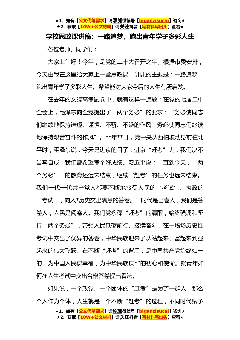 ★1、如有【公文代笔需求】请添加微信号【biganzisucai】咨询★★2、获取【10W+公文材料】请关注抖音【写材料写出头】查看★学校思政课讲稿:一路追梦,跑出青年学子多彩人生各位老师、同学们:大家上午好!今年,是党的二十大召开之年。根据市委安排,今天由我在这里给大家上一堂思政课,讲课的主题是:一路追梦,跑出青年学子多彩人生。希望能对大家今后的人生有所启发。在去年的文综高考试卷中,就有这样一道题:在党的七届二中全会上,毛泽东向全党提出了“两个务必”的要求:“务必使同志们继续地保持谦虚、谨慎、不骄、不躁的作风;务必使同志们继续地保持艰苦奋斗的作风”。**年**日,党中央从西柏坡动身前往北平时,毛泽东说,今天是进京的日子,进京“赶考”去,我们决不当李自成,我们都希望考个好成绩...