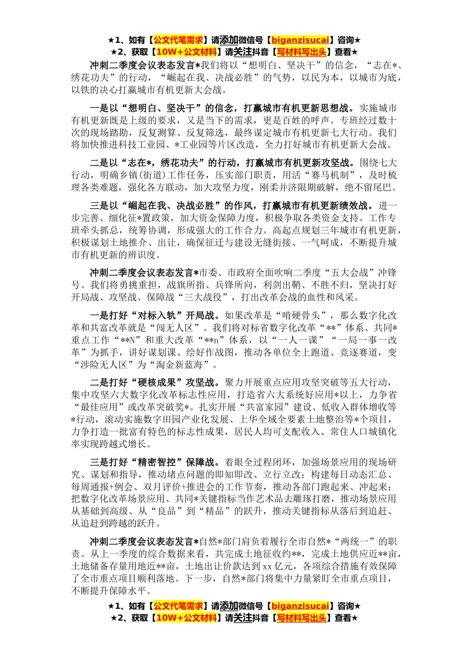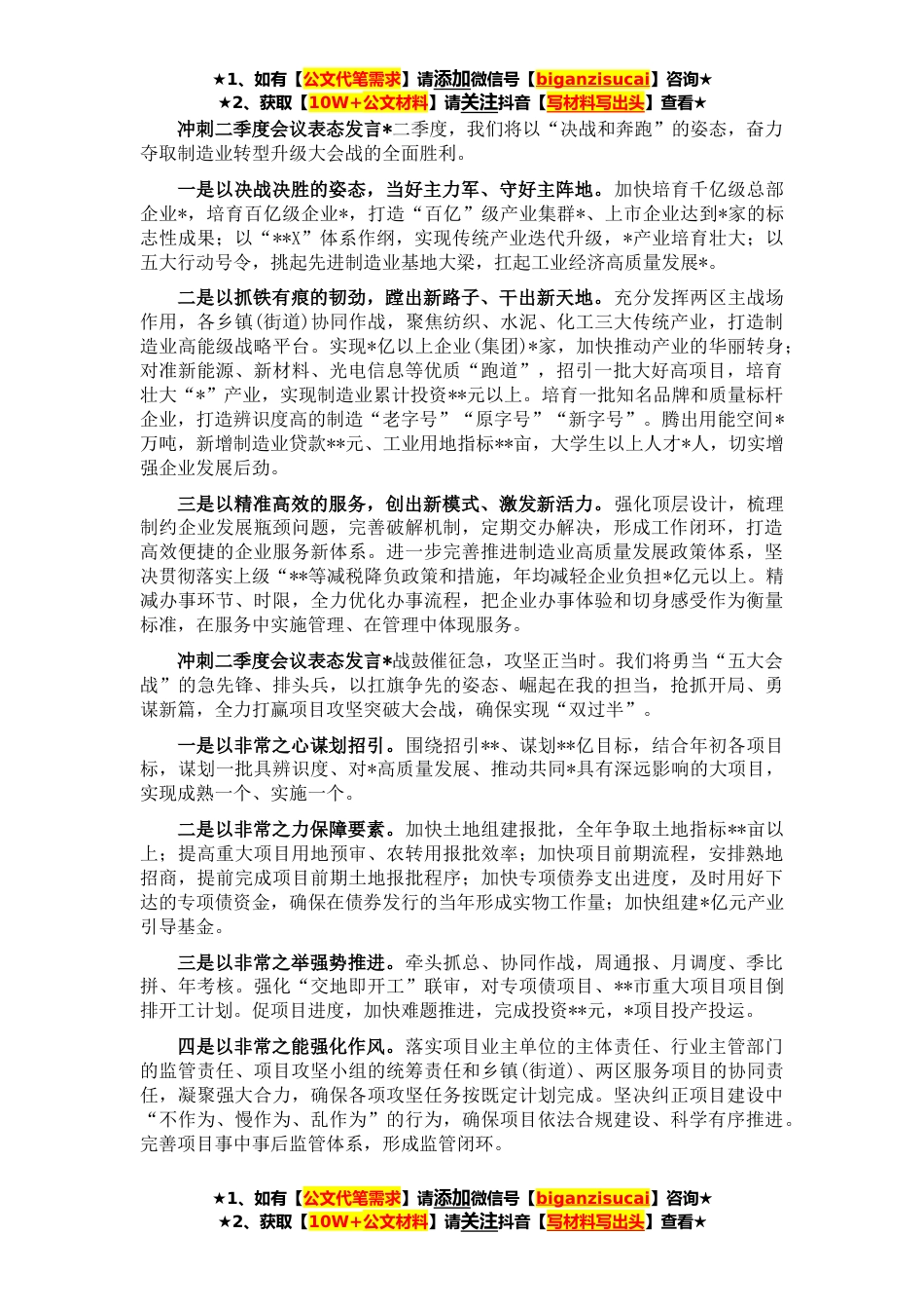★1、如有【公文代笔需求】请添加微信号【biganzisucai】咨询★★2、获取【10W+公文材料】请关注抖音【写材料写出头】查看★冲刺二季度会议表态发言*二季度,我们将以“决战和奔跑”的姿态,奋力夺取制造业转型升级大会战的全面胜利。一是以决战决胜的姿态,当好主力军、守好主阵地。加快培育千亿级总部企业*,培育百亿级企业*,打造“百亿”级产业集群*、上市企业达到*家的标志性成果;以“**X”体系作纲,实现传统产业迭代升级,*产业培育壮大;以五大行动号令,挑起先进制造业基地大梁,扛起工业经济高质量发展*。二是以抓铁有痕的韧劲,蹚出新路子、干出新天地。充分发挥两区主战场作用,各乡镇(街道)协同作战,聚焦纺织、水泥、化工三大传统产业,打造制造业高能级战略平台。实现*亿以上企业(集团)*家,加快...
