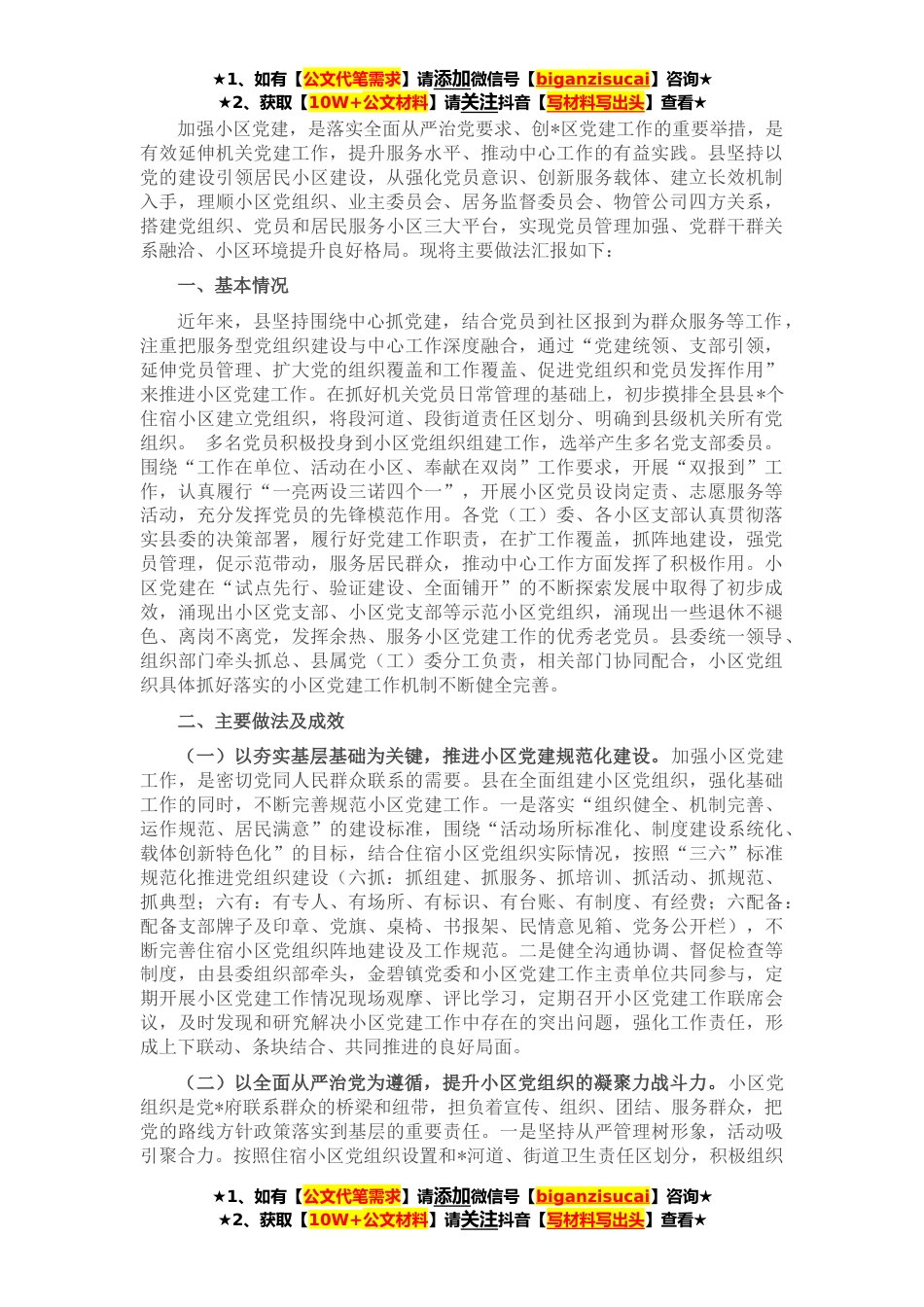★1、如有【公文代笔需求】请添加微信号【biganzisucai】咨询★★2、获取【10W+公文材料】请关注抖音【写材料写出头】查看★加强小区党建,是落实全面从严治党要求、创*区党建工作的重要举措,是有效延伸机关党建工作,提升服务水平、推动中心工作的有益实践。县坚持以党的建设引领居民小区建设,从强化党员意识、创新服务载体、建立长效机制入手,理顺小区党组织、业主委员会、居务监督委员会、物管公司四方关系,搭建党组织、党员和居民服务小区三大平台,实现党员管理加强、党群干群关系融洽、小区环境提升良好格局。现将主要做法汇报如下:一、基本情况近年来,县坚持围绕中心抓党建,结合党员到社区报到为群众服务等工作,注重把服务型党组织建设与中心工作深度融合,通过“党建统领、支部引领,延伸党员管理...