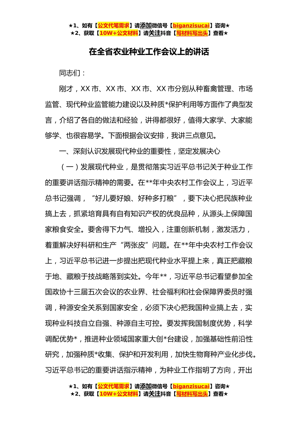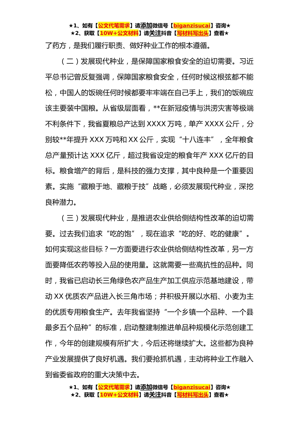 ★1、如有【公文代笔需求】请添加微信号【biganzisucai】咨询★★2、获取【10W+公文材料】请关注抖音【写材料写出头】查看★在全省农业种业工作会议上的讲话同志们:刚才,XX市、XX市、XX市、XX市分别从种畜禽管理、市场监管、现代种业监管能力建设以及种质*保护利用等方面作了典型发言,介绍了各自的做法和经验,讲得都很好,值得大家学、大家能够学、也很容易学。下面根据会议安排,我讲三点意见。一、深刻认识发展现代种业的重要性,坚定发展决心(一)发展现代种业,是贯彻落实习近平总书记关于种业工作的重要讲话指示精神的需要。在**年中央农村工作会议上,习近平总书记强调,“好儿要好娘、好种多打粮”,要下决心把民族种业搞上去,抓紧培育具有自有知识产权的优良品种,从源头上保障国家粮食安全。要舍得...