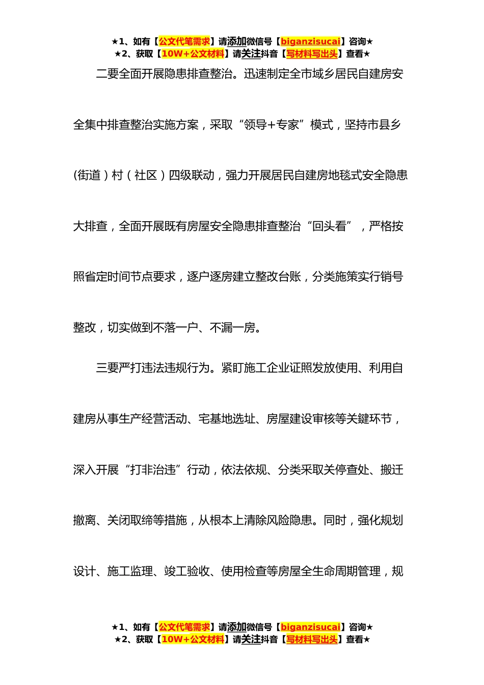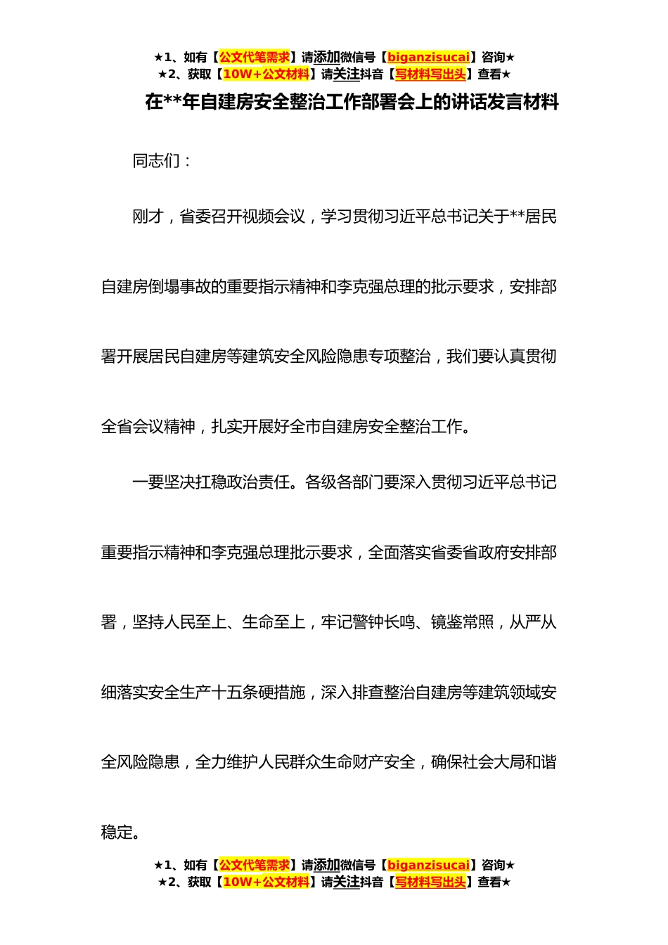 ★1、如有【公文代笔需求】请添加微信号【biganzisucai】咨询★★2、获取【10W+公文材料】请关注抖音【写材料写出头】查看★在**年自建房安全整治工作部署会上的讲话发言材料同志们:刚才,省委召开视频会议,学习贯彻习近平总书记关于**居民自建房倒塌事故的重要指示精神和李克强总理的批示要求,安排部署开展居民自建房等建筑安全风险隐患专项整治,我们要认真贯彻全省会议精神,扎实开展好全市自建房安全整治工作。一要坚决扛稳政治责任。各级各部门要深入贯彻习近平总书记重要指示精神和李克强总理批示要求,全面落实省委省政府安排部署,坚持人民至上、生命至上,牢记警钟长鸣、镜鉴常照,从严从细落实安全生产十五条硬措施,深入排查整治自建房等建筑领域安全风险隐患,全力维护人民群众生命财产安全,确保...