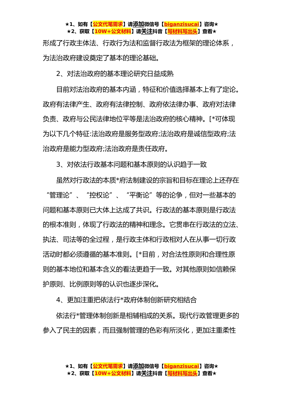 ★1、如有【公文代笔需求】请添加微信号【biganzisucai】咨询★★2、获取【10W+公文材料】请关注抖音【写材料写出头】查看★改革开放以来政府法治建设的综合分析[摘要]改革开放以来,国家的民主法制建设取得了举世瞩目的成就,政府法治建设也取得了突破性进展。通过对目前政府法治建设的现状进行全面分析,总结和发扬其中的经验,发现和纠正其中的问题,将对全面推进法治中国建设产生积极的影响。[关键词]法治政府:依法行政;执法体制十八届三中全会决定指出:建设法治中国,必须坚持依法治国、依法执政、依法行政共同推进,坚持法治国家、法治政府、法治社会一体建设。法治政府建设在其中起着核心性的作用。笔者就此进行分析论述。一、法治政府建设的主要成果和经验当前随着经济社会不断发展和依法治国方略的逐步推...