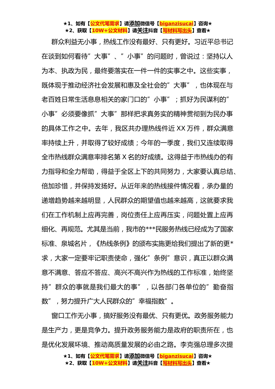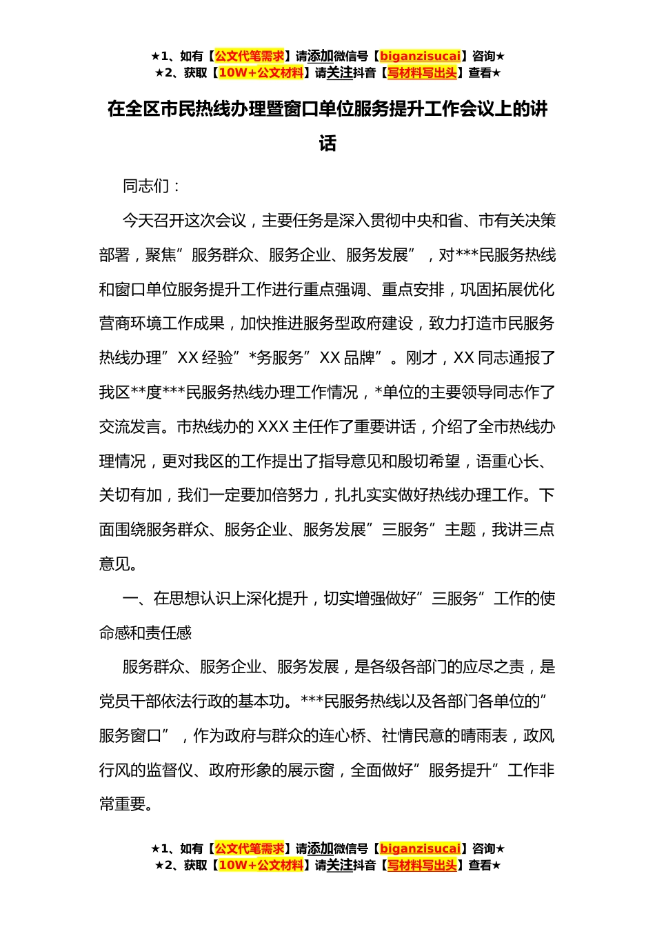★1、如有【公文代笔需求】请添加微信号【biganzisucai】咨询★★2、获取【10W+公文材料】请关注抖音【写材料写出头】查看★在全区市民热线办理暨窗口单位服务提升工作会议上的讲话同志们:今天召开这次会议,主要任务是深入贯彻中央和省、市有关决策部署,聚焦”服务群众、服务企业、服务发展”,对***民服务热线和窗口单位服务提升工作进行重点强调、重点安排,巩固拓展优化营商环境工作成果,加快推进服务型政府建设,致力打造市民服务热线办理”XX经验”*务服务”XX品牌”。刚才,XX同志通报了我区**度***民服务热线办理工作情况,*单位的主要领导同志作了交流发言。市热线办的XXX主任作了重要讲话,介绍了全市热线办理情况,更对我区的工作提出了指导意见和殷切希望,语重心长、关切有加,我们一定要加倍努力...