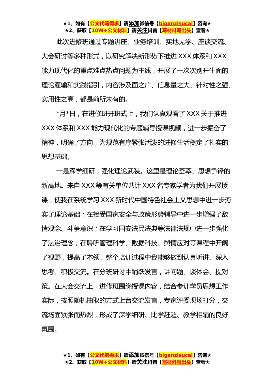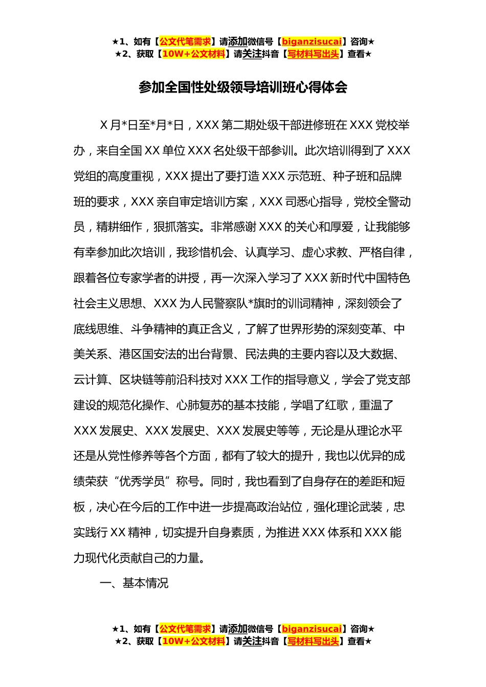 ★1、如有【公文代笔需求】请添加微信号【biganzisucai】咨询★★2、获取【10W+公文材料】请关注抖音【写材料写出头】查看★参加全国性处级领导培训班心得体会X月*日至*月*日,XXX第二期处级干部进修班在XXX党校举办,来自全国XX单位XXX名处级干部参训。此次培训得到了XXX党组的高度重视,XXX提出了要打造XXX示范班、种子班和品牌班的要求,XXX亲自审定培训方案,XXX司悉心指导,党校全警动员,精耕细作,狠抓落实。非常感谢XXX的关心和厚爱,让我能够有幸参加此次培训,我珍惜机会、认真学习、虚心求教、严格自律,跟着各位专家学者的讲授,再一次深入学习了XXX新时代中国特色社会主义思想、XXX为人民警察队*旗时的训词精神,深刻领会了底线思维、斗争精神的真正含义,了解了世界形势的深刻变革、中美关系、港区...