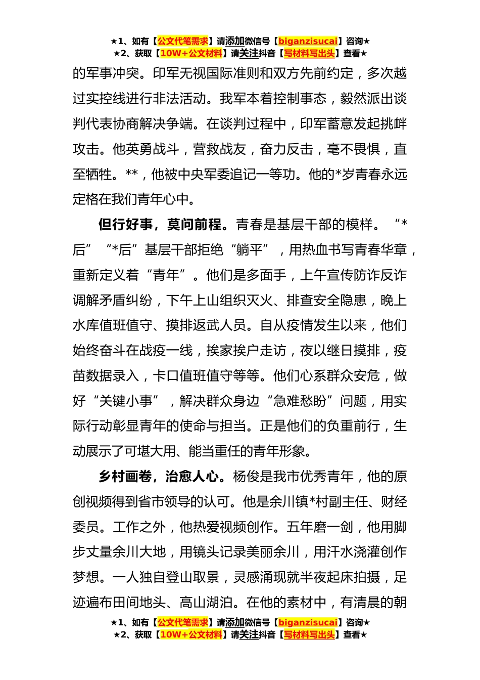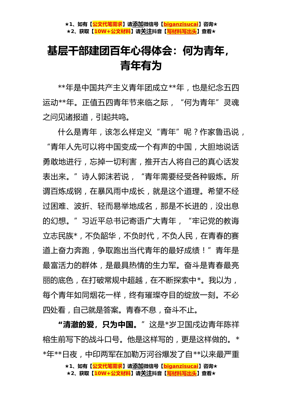 ★1、如有【公文代笔需求】请添加微信号【biganzisucai】咨询★★2、获取【10W+公文材料】请关注抖音【写材料写出头】查看★基层干部建团百年心得体会:何为青年,青年有为**年是中国共产主义青年团成立**年,也是纪念五四运动**年。正值五四青年节来临之际,“何为青年”灵魂之问见诸报道,引起共鸣。什么是青年,该怎么样定义“青年”呢?作家鲁迅说,“青年人先可以将中国变成一个有声的中国,大胆地说话勇敢地进行,忘掉一切利害,推开古人将自己的真心话发表出来。”诗人郭沫若说,“青年需要经受各种锻炼。所谓百炼成钢,在暴风雨中成长,就是这个道理。希望不经过困难、波折、轻而易举地成名,那是不长进的,没出息的幻想。”习近平总书记寄语广大青年,“牢记党的教诲立志民族*,不负韶华,不负时代,不负...